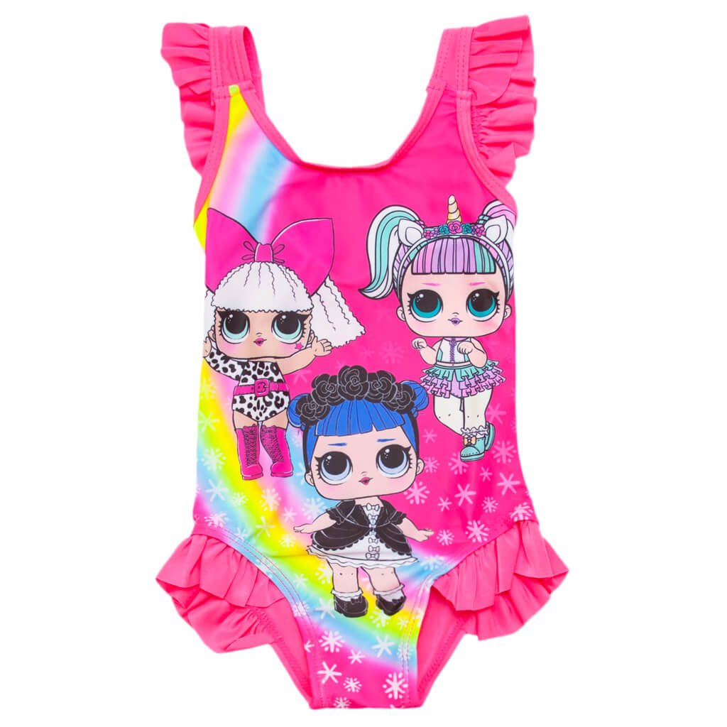 Купальников много не бывает, поэтому в гардеробе Вашей принцессы обязательно должно появиться несколько новых купальников от ТМ "Арлекин"! Данный сдельный купальник для девочки точно понравится ребёнку, ведь он имеет принт мультяшных кукол LOL, которые так нравятся девочкам. Яркий купальник малинового оттенка на солнце будет смотреться еще красочнее! Сверху на бретельках, а также на проймах для ножек, пришиты рюши. Пляжный купальник с рюшами - что может быть ещё более милым и девчачьим? Изделие превосходно тянется, при этом, отлично сохраняет первоначальную форму.