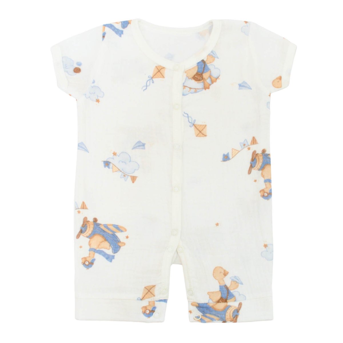 Представленная модель детского комбинезона молочного цвета с принтом гусей выполнена из высококачественного полотна - муслина, который мягко прилегает к коже малыша, не вызывая раздражения. Легкая, приятная на ощупь ткань обеспечивает циркуляцию воздуха, помогая избежать перегрева даже в жаркие дни. Комбинезон имеет удобный крой с коротким рукавом, который не сковывает движений, позволяя ребенку активно познавать мир. Полностью растегивающаяся передняя часть на кнопках делает процесс одевания и переодевания максимально быстрым и простым. Нежный принт делает комбинезон стильным выбором для прогулок, сна или игр.