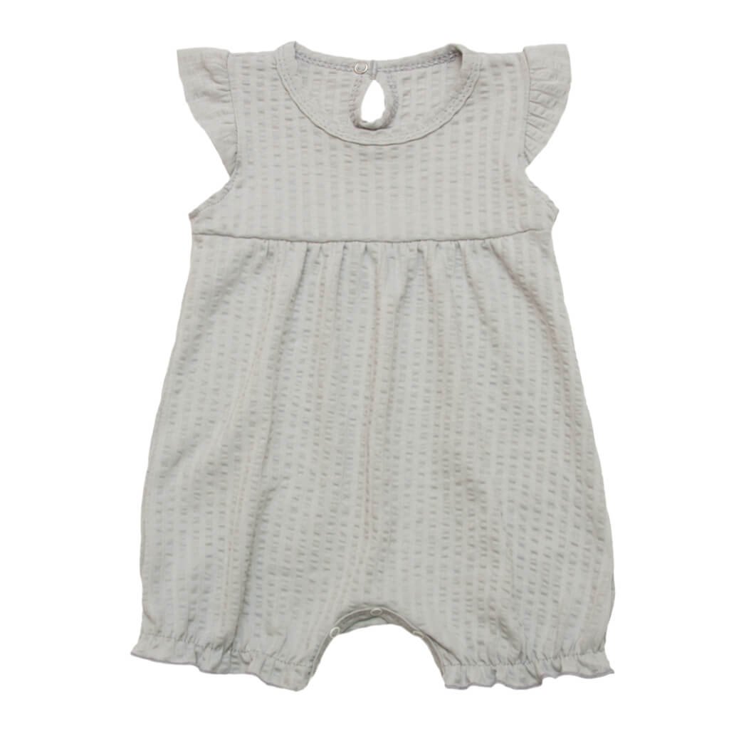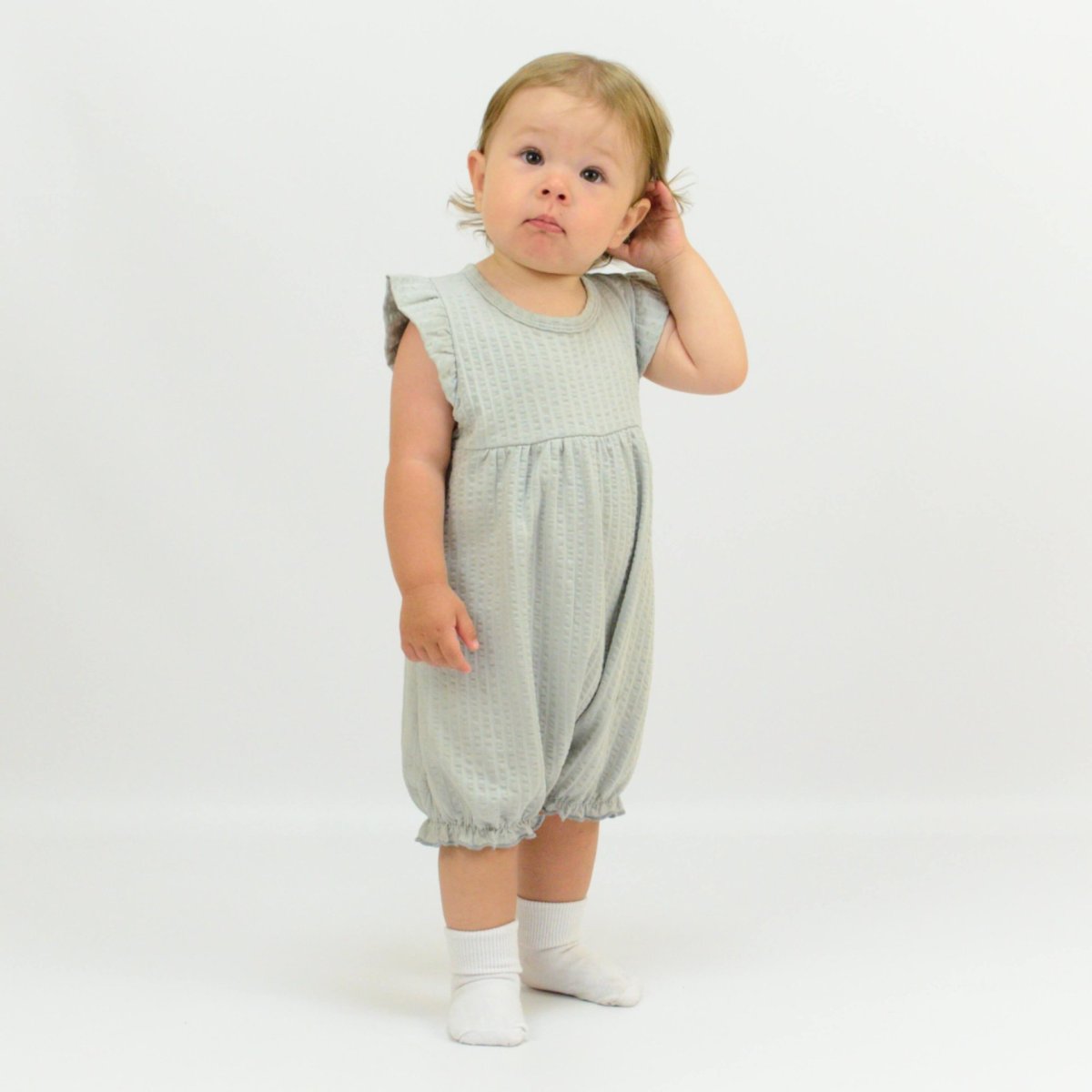 Песочник из интерлока жаккард серого цвета для девочки станет отличным выбором на тёплое время года. Однотонная расцветка делает модель универсальной и уместной как для дома, так и для прогулок. Мягкое полотно приятно к телу, хорошо пропускает воздух и не раздражает чувствительную кожу ребёнка. Особенность модели - очаровательные «крылышки» на плечиках, которые добавляют наряду оригинальности. Сзади предусмотрена кнопочка, облегчающие процесс переодевания, а между ножек - дополнительные застёжки для быстрой смены подгузника. Низ изделия собран на тонкую эластичную резинку, что обеспечивает мягкое прилегание, не оставляя следов на коже.