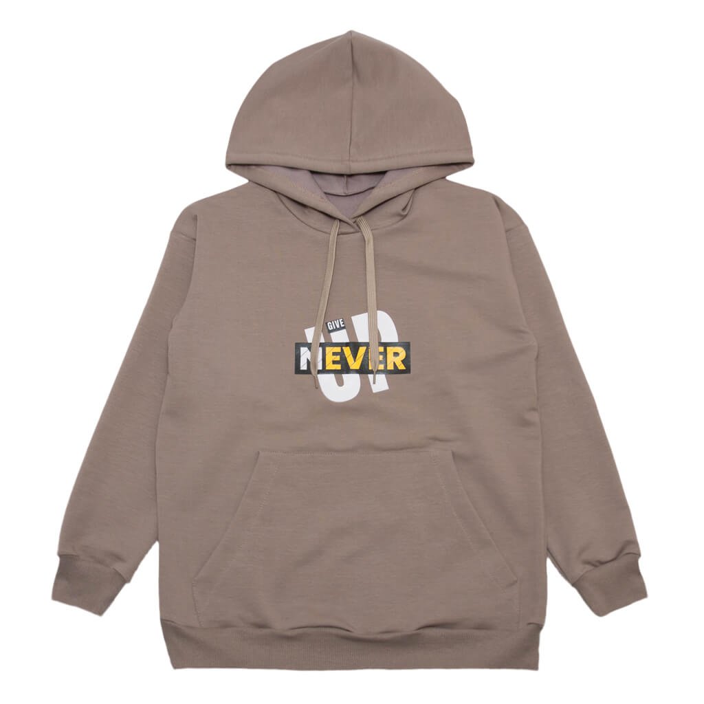 Чоловіче худі пісочного кольору з принтом Never Give up, виконане з якісної двонитки, стане чудовим вибором для прохолодної погоди. Цей матеріал поєднує в собі міцність і м'якість, завдяки чому худі комфортно носиться і довго зберігає свій первісний вигляд. Капюшон на зав'язці дає змогу регулювати його щільність. На передній стороні худі розташований стильний принт, що додає модний акцент до повсякденного образу. Виріб доповнено кишенькою та еластичними манжетами по краях. Завдяки універсальному дизайну худі легко комбінується з різними стилями одягу, чи то повсякденні, чи то спортивні образи.
