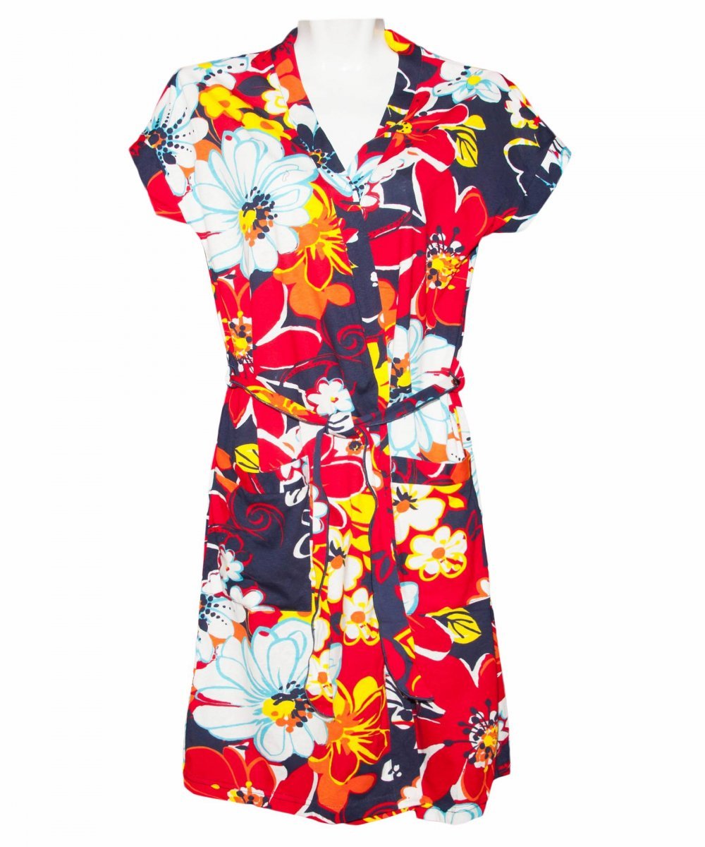 Напевно, для кожної жінки в якості домашнього одягу найкращим варіантом є халат. У нашому інтернет-магазині Ви зможете знайти не одну модель жіночого халата, який точно підійде саме Вам! Ми представляємо один з варіантів трикотажних халатів - жіночий халат "Кімоно", виготовлений з бавовняного полотна кулір. Зав'язується цей халат поясочком. Рукави у виробу короткі, з боків розташовані кишені. Цю модель ми пропонуємо Вам в яскравих квіткових забарвленнях, які завжди тішитимуть Ваше око!