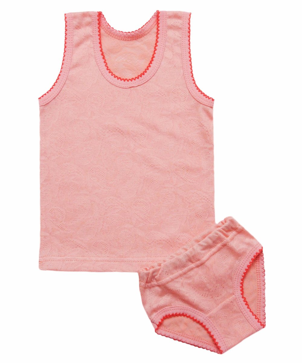 Відмінний комплект нижньої білизни для вашої крихітки, неодмінно згодиться їй в гардеробі. Комплект складається з майки і трусів. Виготовлений з бавовняного полотна - мультиріп. Краї комплекту оброблені бейкою, а прикрашає бейку - крошета. Яскраві забарвлення комплектів, дозволять обрати Вам вподобану і порадувати своє малятко новинками від ТМ Арлекін! У такому комплекті вашій дівчинці буде комфортно, адже резинка на поясі не здавлює, крошета настільки м'яка, що не натирає дитині. Приємних покупок в нашому інтернет-магазині!
