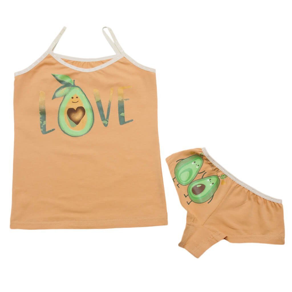 Нову модель дитячого комплекту спідньої білизни виконано з якісного еластичного матеріалу - стрейч-куліра бежевого кольору. Це полотно дуже м'яко та ніжно облягає тіло, даючи змогу шкірі дихати протягом усього дня. Маєчка виконана на тоненьких бретельках. М'яка резинка на трусиках добре зафіксує виріб, водночас не буде тиснути і доставляти дискомфорт. Комплект прикрашений красивим принтом авокадо, який точно сподобається кожній маленькій принцесі. Також представлена модель відмінно переносить багаторазове прання та довго зберігає свій первісний вигляд і форму.