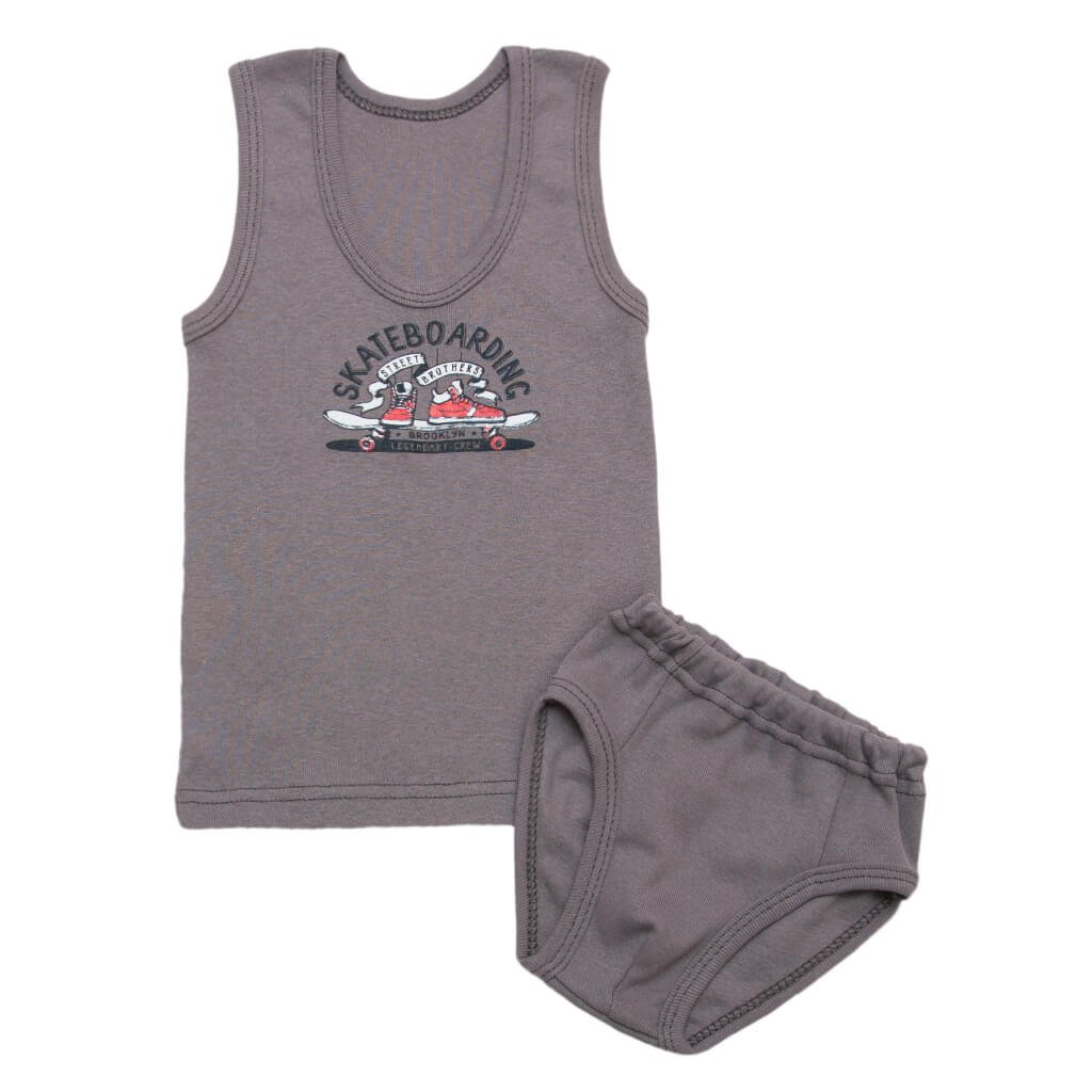 Хлопчачий комплект графітового кольору, який будь-які батьки можуть придбати у нас в інтернет-магазині «Арлекін». Складається з майки і звичайних трусиків, які завжди залишаються необхідними і незамінними. Відшитий комплектик з однотонного натурального 100% полотна. На передній поличці майки нанесено фарбування, за кольором відповідне до забарвлень полотна, але темніше по тону. Трусики простого крою під вузьку і вільну резинку. Горловина і пройми на майці, а також вирізи під ніжки на трусах, оброблені під бейку з розкладальником з основного полотна.