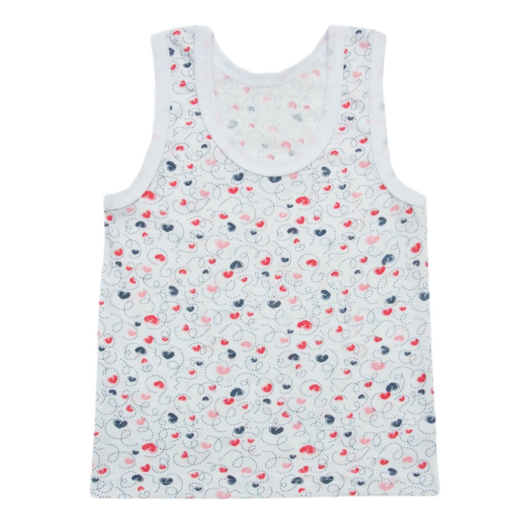Кулірна майка з простим кроєм, без прикрас і декору. Майка чудово підходить як натільна піддівка, також в ній можна спати або ходити по будинку. Тонке кулірне полотно білого кольору з принтом червоних і синіх сердечок відмінно пропускає повітря, дає можливість тілу дихати. Тканина щільно прилягає до тіла, по цьому під одягом не совається і не викликає незручностей. Майки представлені в різних забарвленнях дівчат, ви можете придбати собі потрібний колір на будь-який смак. ТМ Арлекін надає різноманітну продукцію.