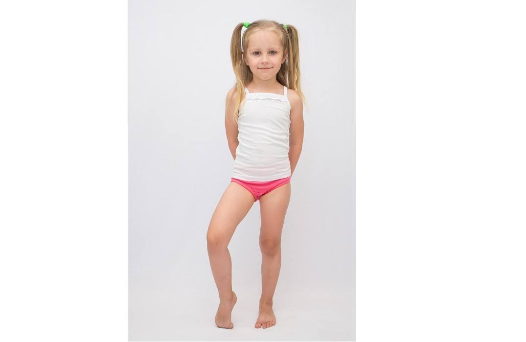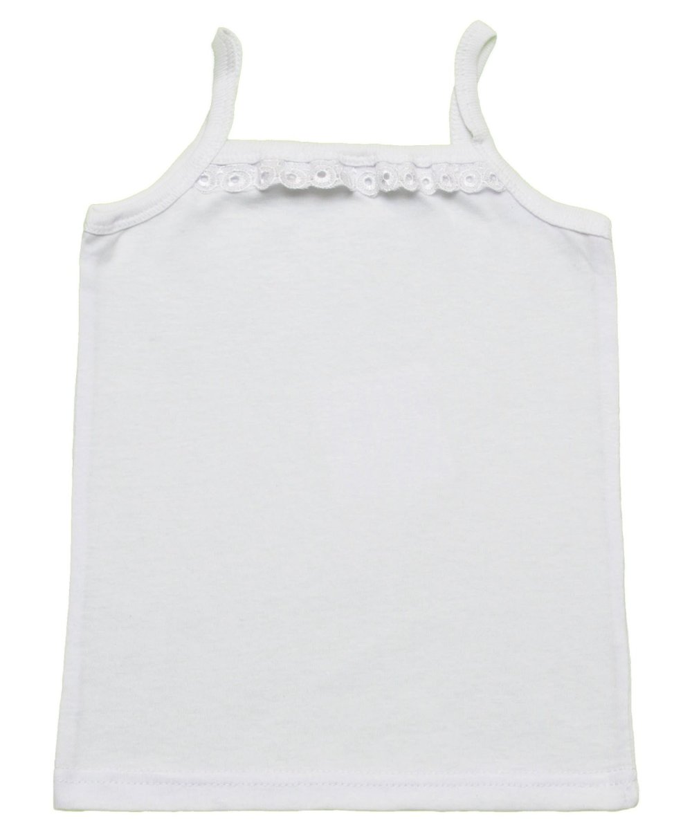 Білий бавовняний топ для дівчинки. Бретелі топа з бавовняного полотна, тонкі. Топ прикрашений мереживною рюшою спереду. Топ відмінно сидить на фігурі, підійде для дівчаток у віці від 2 до 8 років. Відмінний вибір, як для дитячого саду, так і для школи. Полотно тонке, кулірне, відмінно пропускає повітря. Модель можна носити під блузи, светри, кофти або вдома як топ. У дитячому садку в такому топі можна спати в літню пору року.