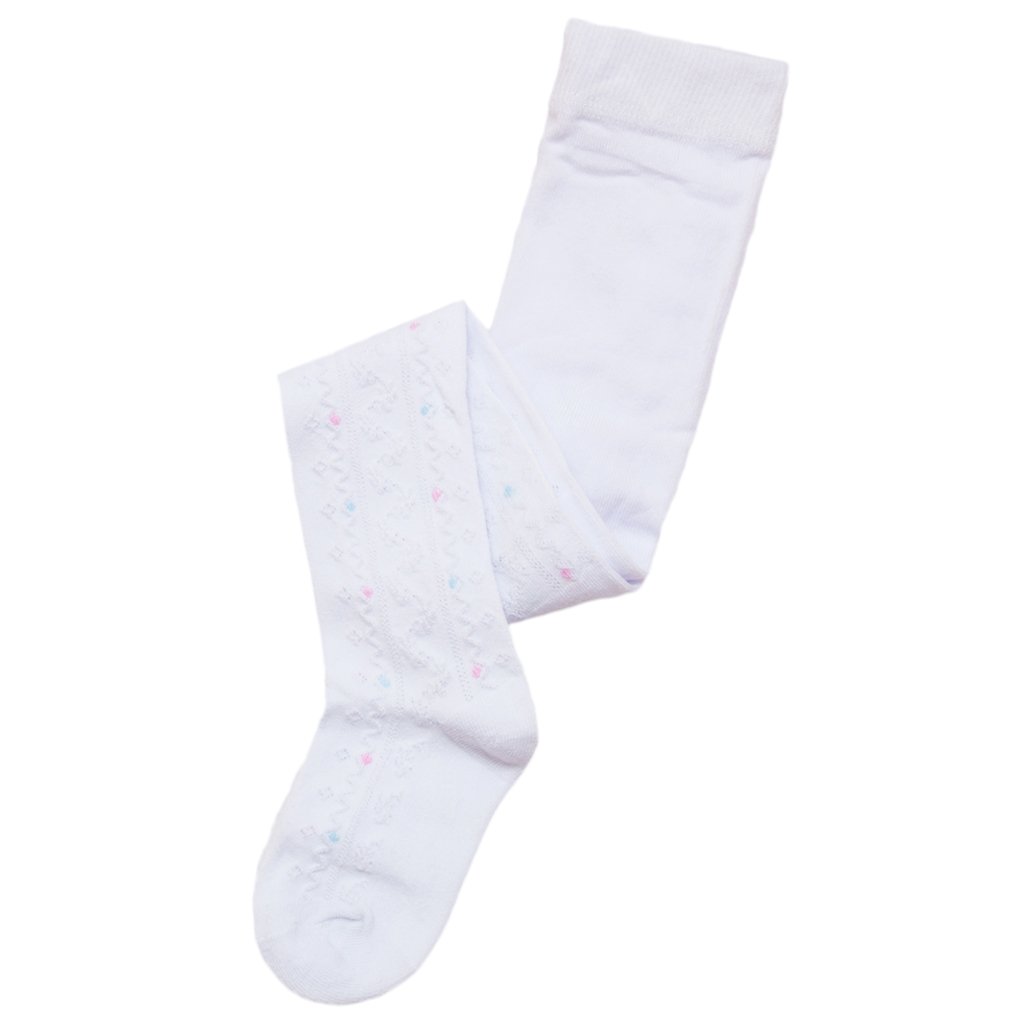 Білі колготи для дівчинки обов'язково повинні бути частиною гардеробу кожної юної модниці! Адже дитячі білі колготки можуть надати нарядності навіть звичайному, повсякденному образу. Тканина, з якої виготовлено виріб, дуже м'яка і приємна на дотик, складається з бавовни і еластану. Саме за рахунок еластану колготки добре тягнуться, при цьому, не деформуються і чудово тримають первісну форму. На колготах є малюнок у вигляді різних візерунків такого ж кольору, що і сам виріб, а також є вкраплення рожевого і блакитного, що виглядає дуже красиво!