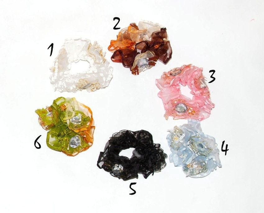 Ажурна яскрава резинка для дівчинки може стати відмінним доповненням будь-якого наряду. Резинка призначена для великого об'єму волосся. Вона дуже цікава і виконана відразу з декількох матеріалів: органзи і кольорового плетучого шнура. Резинка прикрашена квітками з такої ж органзи з великими камінням-стразами і декоровані мереживною стрічкою в тон резинки. Основою резинки є шнурок-резинка, який добре розтягується, але при цьому довгий час не втрачає своєї форми. Ви зможете обрати вподобане вам забарвлення з: чорного, білого, рожевого, блакитного, коричнево-помаранчевого і помаранчево-зеленого.