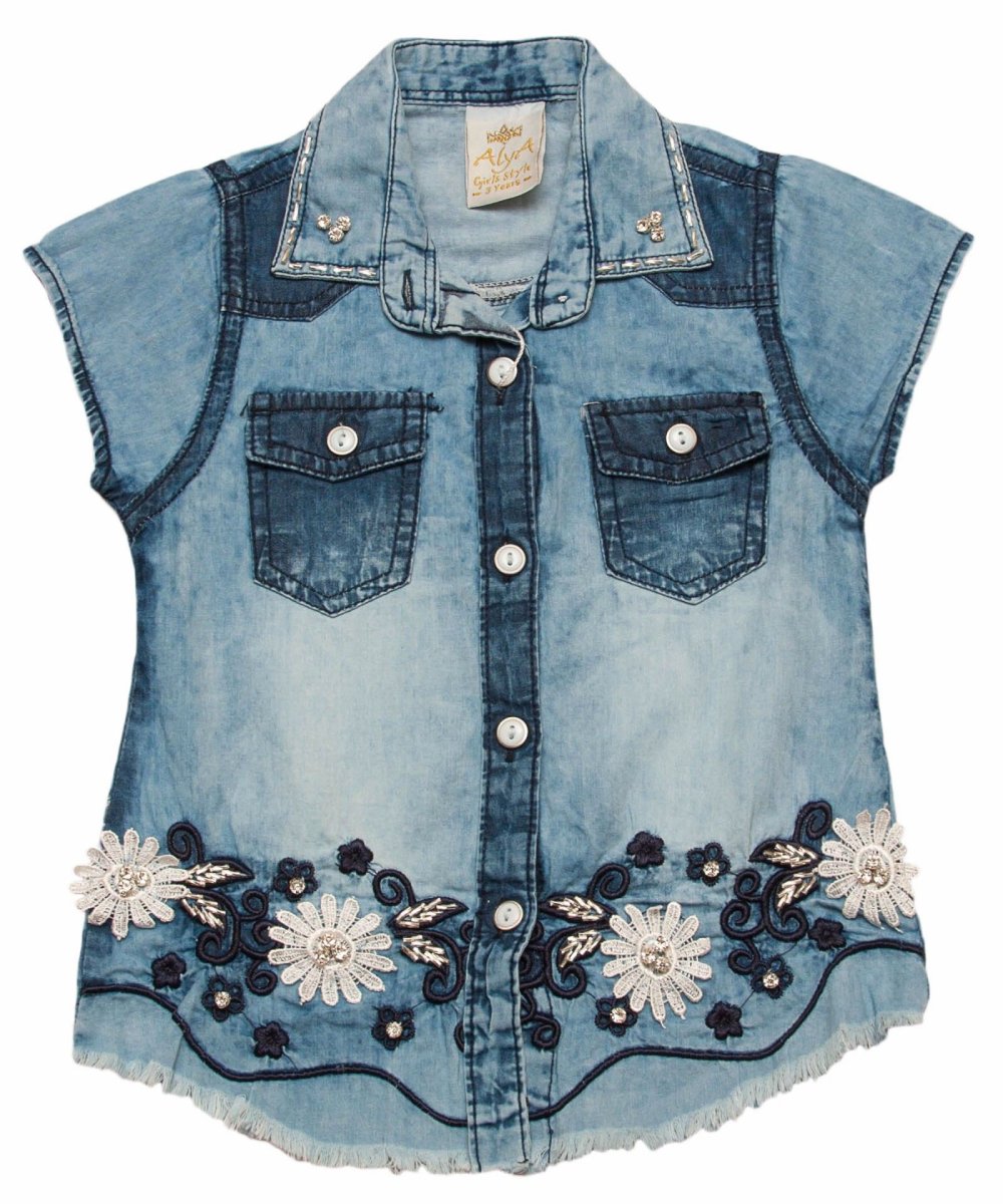 Сьогодні неможливо уявити гардероб маленької модниці без усіма улюблених джинсових костюмів, спідничок, комбінезонів. Тому ТМ Арлекін із задоволенням представляє модну і красиву джинсову сорочку для дівчаток. Дана моделька прикрашена всілякими стразиками, намистинками, ажурними квіточками і цікавою вишивкою у вигляді квіточок по низу вироби. На передніх поличках є два маленьких кишеньки. Короткі рукавчики даної моделі сорочки дозволяють носити її в літній період і виглядати модно і красиво кожен день.