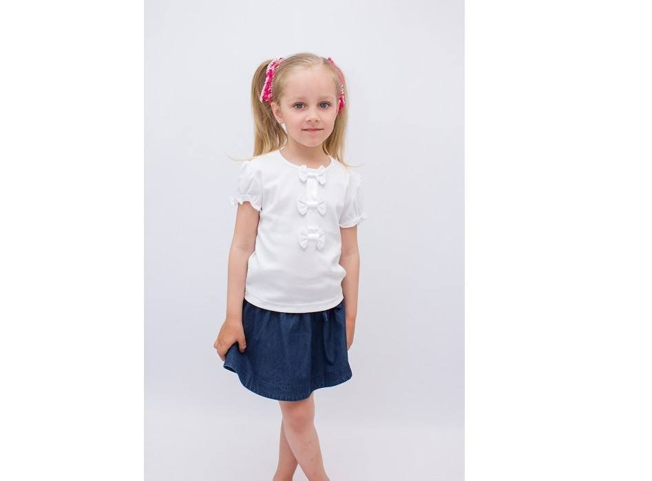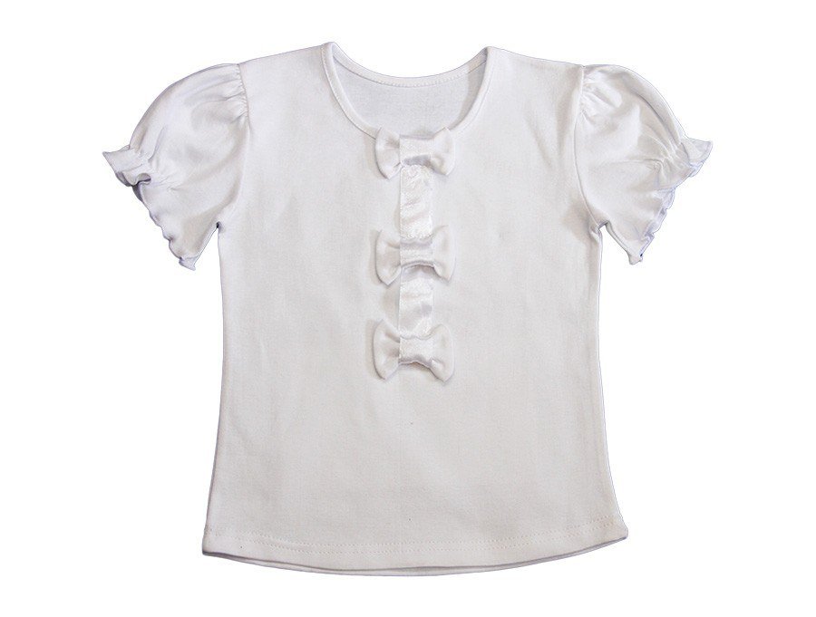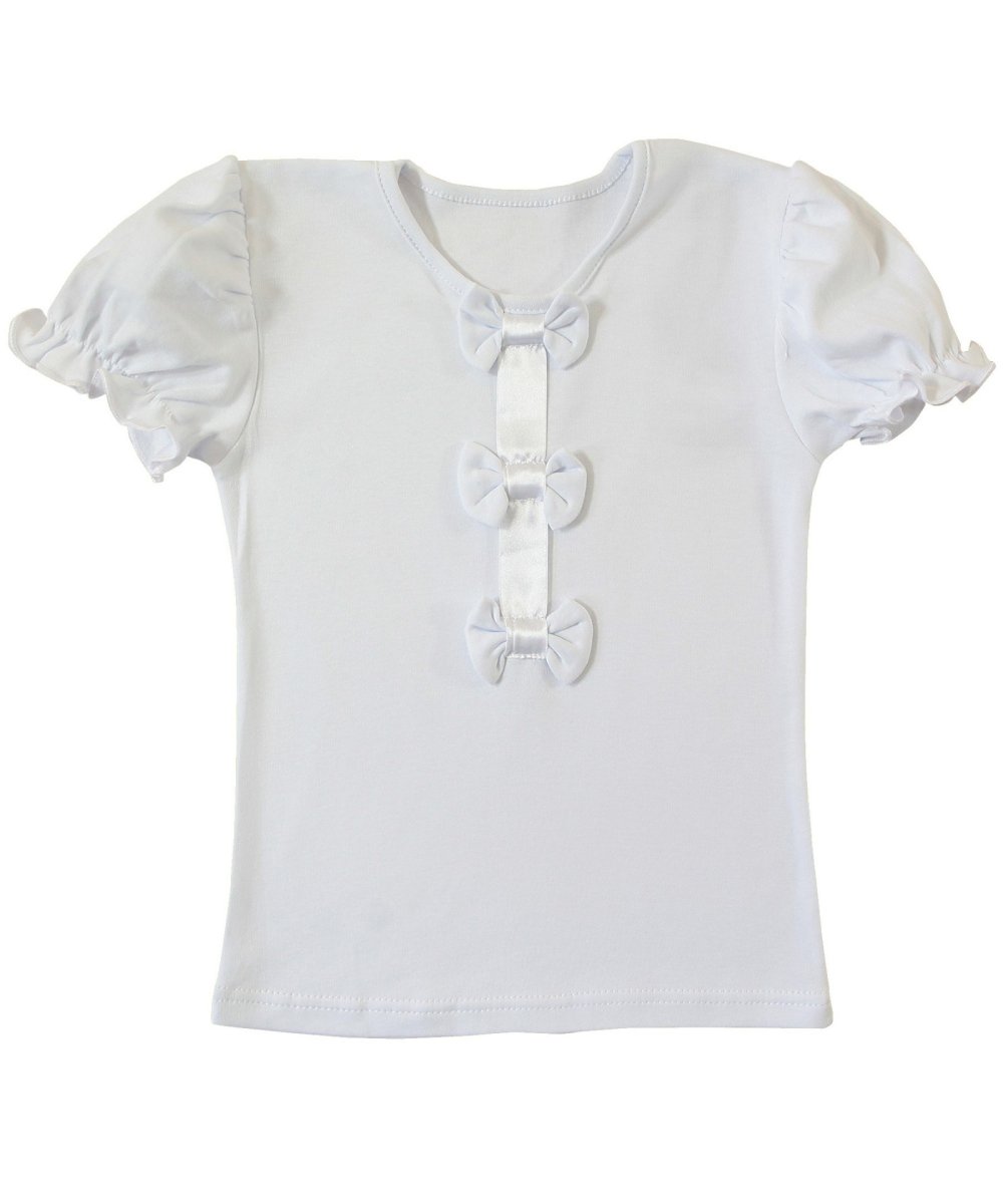 Білосніжна нарядна блуза для дівчинки. Відкритий комір, короткі призборені рукавці ліхтарики. Спереду блуза красиво прикрашена бантиками і атласною стрічкою. Блуза прекрасний варіант в дитячому одязі для дівчаток адже вона може замінити звичайну футболку і зробити наряднішим і привабливішим образ дитини. Білосніжна блуза прекрасне доповнення до спідниці, до брюк або навіть до сарафанчика. Така білосніжна блуза може носитися як поверх одягу, так і в заправленому виді, і в обох варіантах це виглядатиме симпатично і оригінально. Підійде для святкових і урочистих випадків, й так само на кожен день. Склад: 100% бавовна.