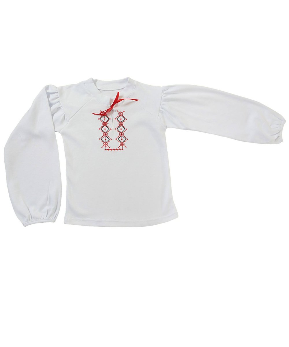 Для справжніх українок пропонуємо вам блузочку-вишиванку. Прекрасна модель для дівчаток. Якісна, м'яка, дуже приємна до тіла, в той же час дуже цікавого крою. Вишиванкою таку блузочку робить акуратна вишивка на передній планці в стриманому національному стилі. Червоний бантик надає блузочці закінчений вид. Тканина – щільний трикотаж. Блузочка підійде для використання в щоденній носівлі. Така річ буде найулюбленішою в гардеробі вашої маленької модниці, тому що її можна одягнути і в школу зі шкільною спідницею, й з улюбленими джинсами.