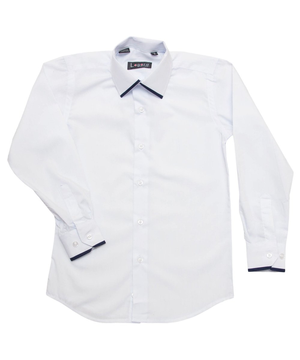 Біла приталена сорочка з довгим рукавом просто незамінна річ шкільного гардеробу хлопчика. По краю манжета і відкладного коміра є контрастне темно-синє оздоблення, що надає цій моделі свою особливість. Ця модель буде добре виглядати і з класичними шкільними брюками, і з джинсами в повсякденному носінні. Сорочка застібається на гудзики. Тканина високої якості, чудово носиться та стирається. Ви і Ваша дитина безперечно оціните цю модель сорочки. Поспішайте оновити гардероб вашого школяра!