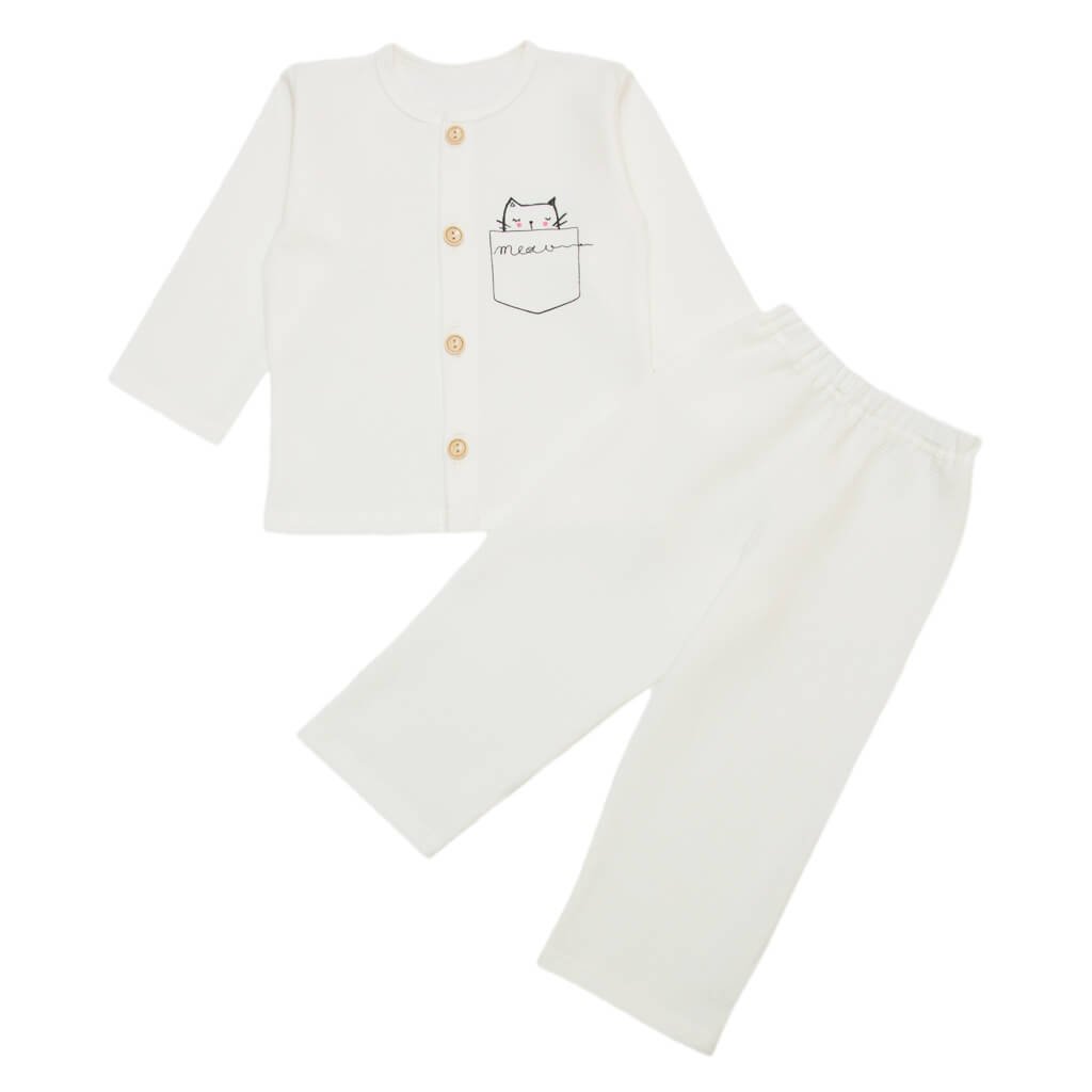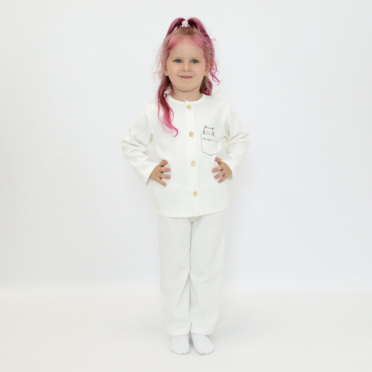 Кожна дитина потребує зручної та м'якої піжами, яка подарує затишні сни та комфорт під час відпочинку. Цей комплект виготовлений з полотна інтерлок вафелька молочного кольору з малюнком котика, піжама забезпечує природну вентиляцію, приємна на дотик і відмінно зберігає тепло. Кофточка виконана на ґудзиках, що полегшує процес переодягання, а вільний крій не сковує рухів. Округлий виріз горловини додає комфорту, а стильний дизайн робить піжаму універсальною. Штанці на м'якій резинці надійно фіксуються на талії, не перетягуючи животик дитини.