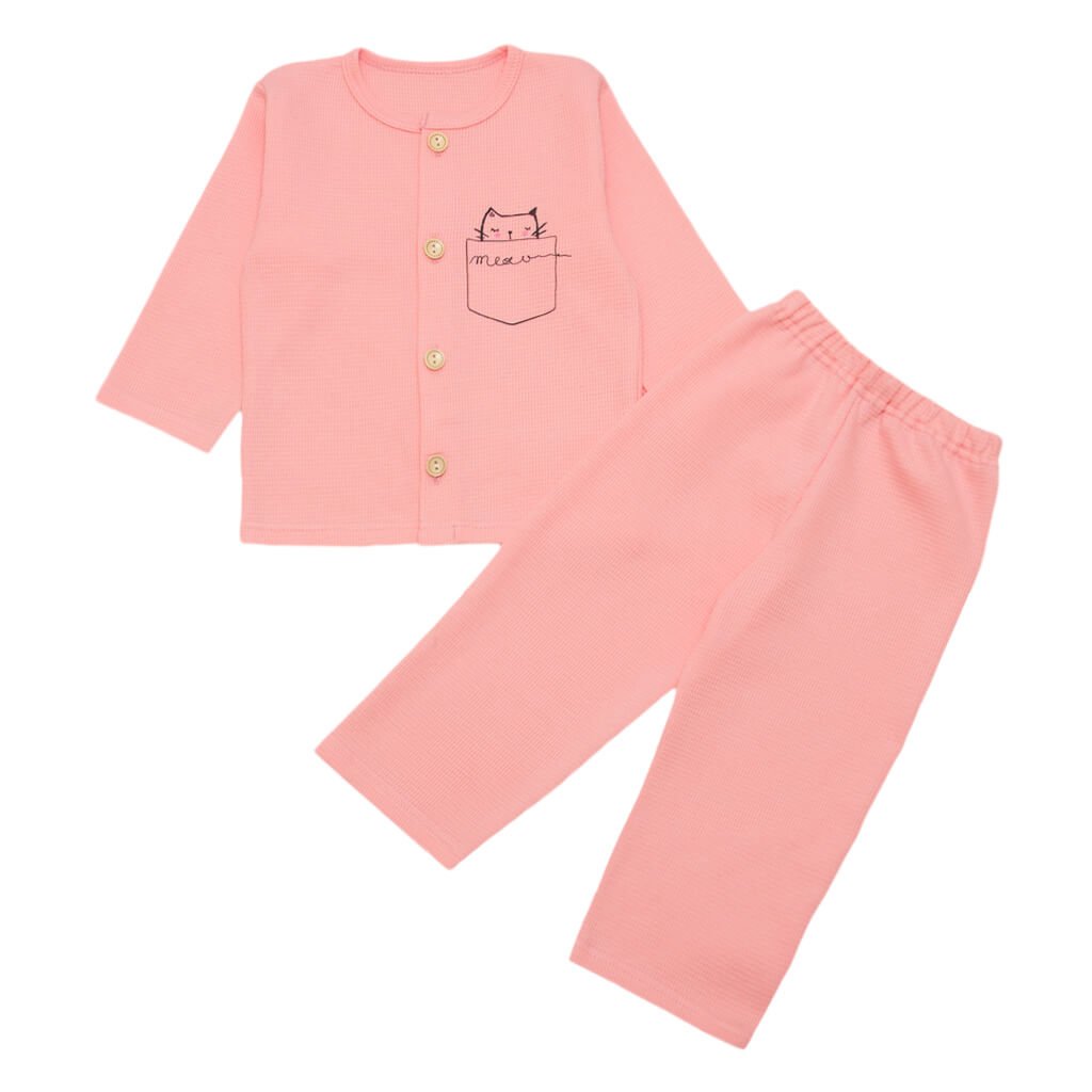 Кожна дитина потребує зручної та м'якої піжами, яка подарує затишні сни та комфорт під час відпочинку. Цей комплект виготовлений з полотна інтерлок вафелька персикового кольору з малюнком котика, піжама забезпечує природну вентиляцію, приємна на дотик і відмінно зберігає тепло. Кофточка виконана на ґудзиках, що полегшує процес переодягання, а вільний крій не сковує рухів. Округлий виріз горловини додає комфорту, а стильний дизайн робить піжаму універсальною. Штанці на м'якій резинці надійно фіксуються на талії, не перетягуючи животик дитини.