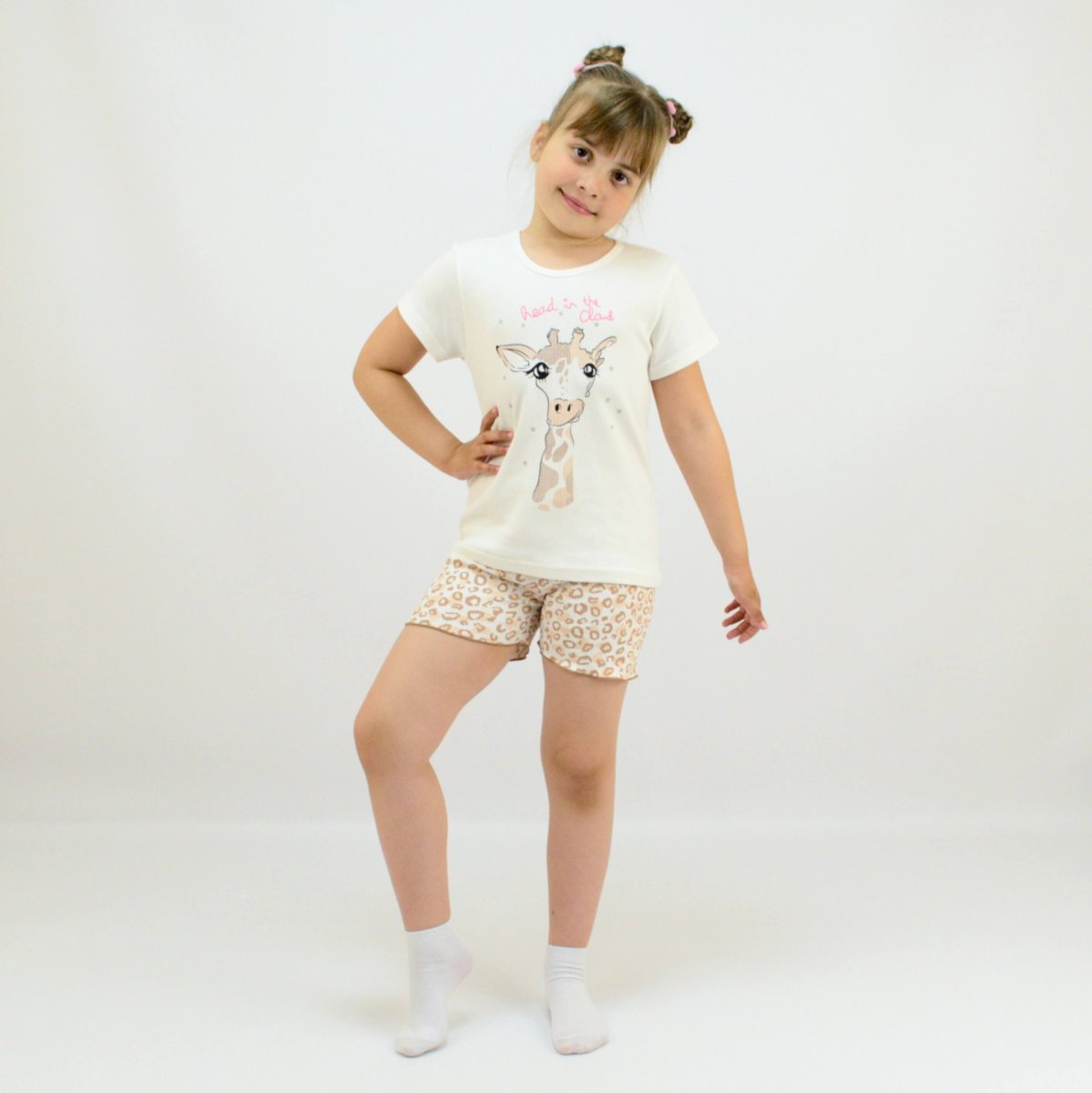 Новий комплект дитячої піжами молочного кольору з принтом жирафа для дівчинки виготовлений з якісного полотна інтерлок рапорт ідеально підійде для весняно-літнього сезону. Комплект піжами складається з футболочки з коротким рукавом і легких шортиків, що робить його відмінним вибором як для сну, так і для дому. М'яка, дихаюча тканина забезпечує комфорт, ніжно прилягаючи до шкіри та запобігаючи появі подразнень. Красиві принти і різноманітність забарвлень обов'язково сподобаються маленьким модницям. Шорти на еластичній резинці гарантують зручність і легкість надягання, не здавлюючи і не заважаючи рухам.