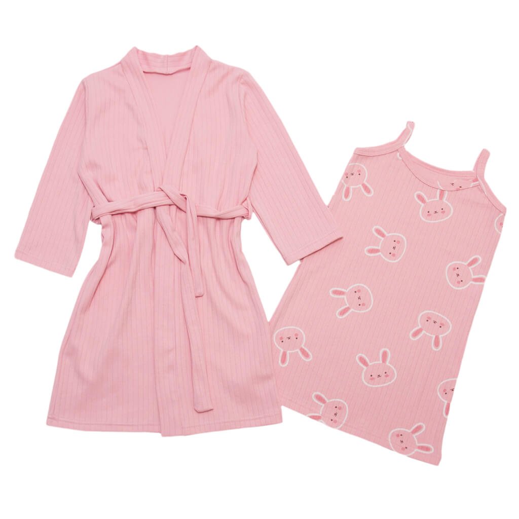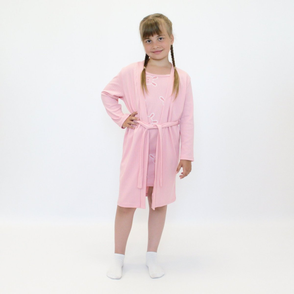 Представлений дитячий комплект кольору пудра з принтом зайчиків для дому поєднує в собі практичність, затишок і стиль. Комплект складається з нічної сорочки і зручного халата, виконаних з м'якого полотна інтерлок рапорт, яке ідеально підходить для делікатної шкіри дитини. Матеріал добре зберігає тепло, залишаючись при цьому легким і дихаючим, що робить його чудовим вибором для домашнього проведення часу. Нічна сорочка виконана в лаконічному дизайні з ніжним малюнком. Вона має вільний крій і тонкі бретелі, забезпечуючи максимальну свободу рухів. Халат із поясом доповнює комплект, створюючи завершений образ.