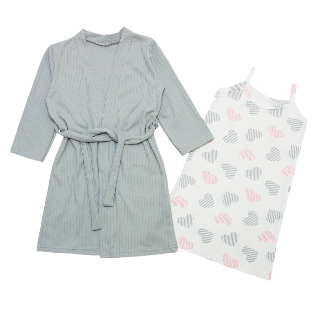 Представлений дитячий комплект для дому поєднує в собі практичність, затишок і стиль. Комплект складається з нічної сорочки молочного кольору з принтом сердець і зручного халата сірого кольору, виконаних з м'якого полотна інтерлок рапорт, яке ідеально підходить для делікатної шкіри дитини. Матеріал добре зберігає тепло, залишаючись при цьому легким і дихаючим, що робить його чудовим вибором для домашнього проведення часу. Нічна сорочка виконана в лаконічному дизайні з ніжним малюнком. Вона має вільний крій і тонкі бретелі, забезпечуючи максимальну свободу рухів. Халат із поясом доповнює комплект, створюючи завершений образ.