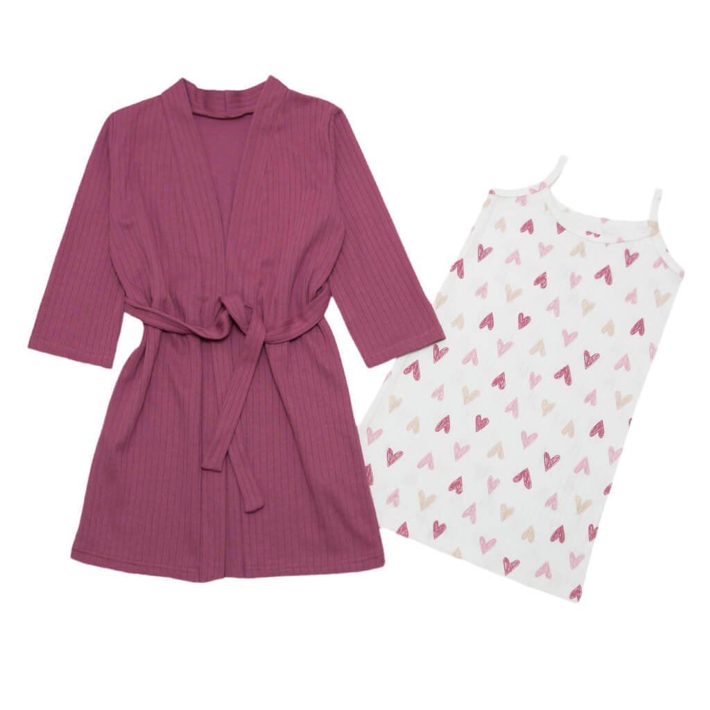 Представлений дитячий комплект для дому поєднує в собі практичність, затишок і стиль. Комплект складається з нічної сорочки молочного кольору з принтом сердечок і зручного халата сливового кольору, виконаних з м'якого полотна інтерлок рапорт, яке ідеально підходить для делікатної шкіри дитини. Матеріал добре зберігає тепло, залишаючись при цьому легким і дихаючим, що робить його чудовим вибором для домашнього проведення часу. Нічна сорочка виконана в лаконічному дизайні з ніжним малюнком. Вона має вільний крій і тонкі бретелі, забезпечуючи максимальну свободу рухів. Халат із поясом доповнює комплект, створюючи завершений образ.