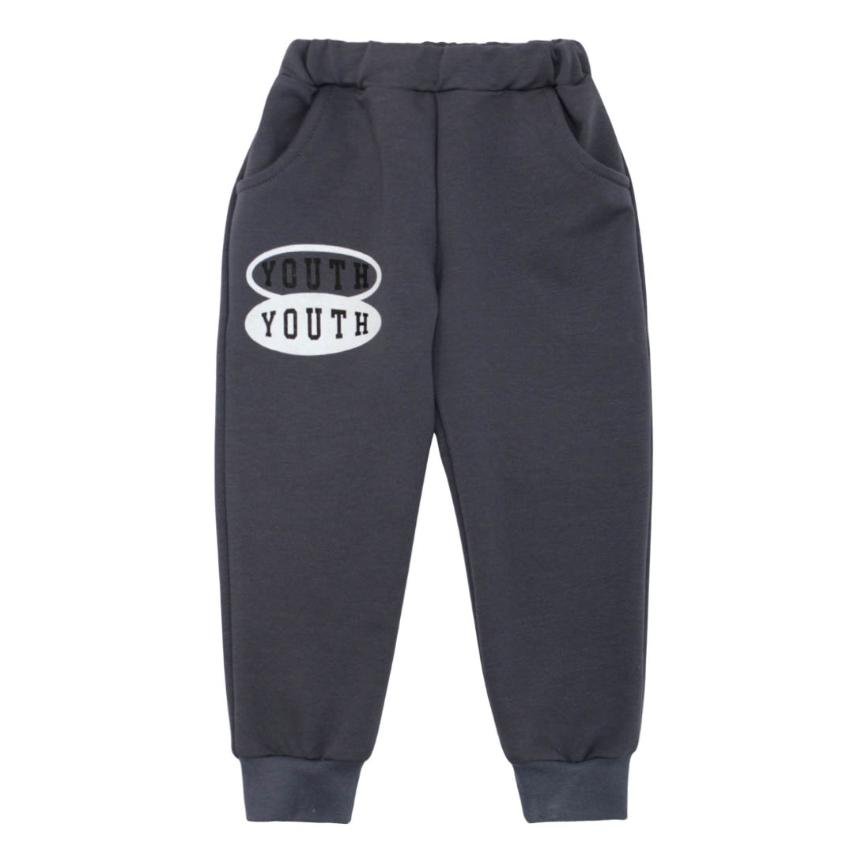 Спортивні дитячі штани темно-сірого кольору з написом Youth пошиті з якісного двуниткового полотна. Полотно досить щільне, не вередливо у догляді, сильно не мнеться. Вироби з такого полотна довго зберігають свій первинний колір і форму. Модель штанів цікава і стильна, до низу штанини завужені, що дуже модно цього сезону. До низу штанів манжети з еластичного стрейча. З боків штанів є кишені. Прикрашає виріб малюнок спереду штанів. У таких брюках Ваша дитина буде найстильнішим і моднішим серед однолітків.