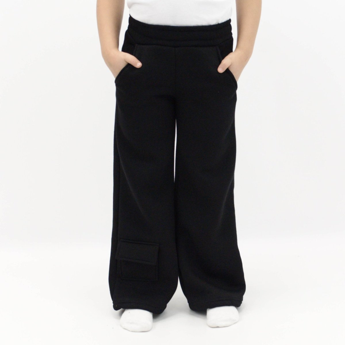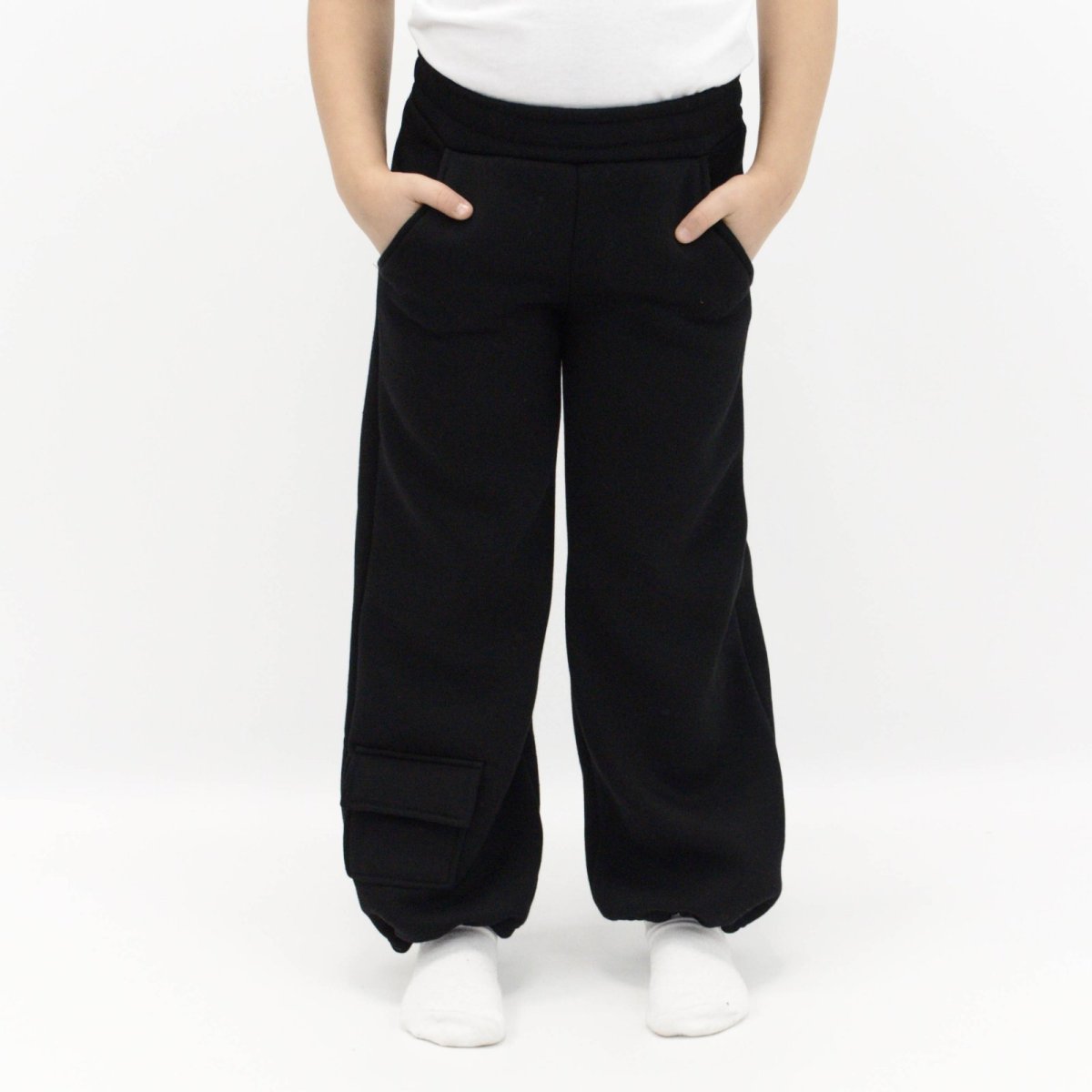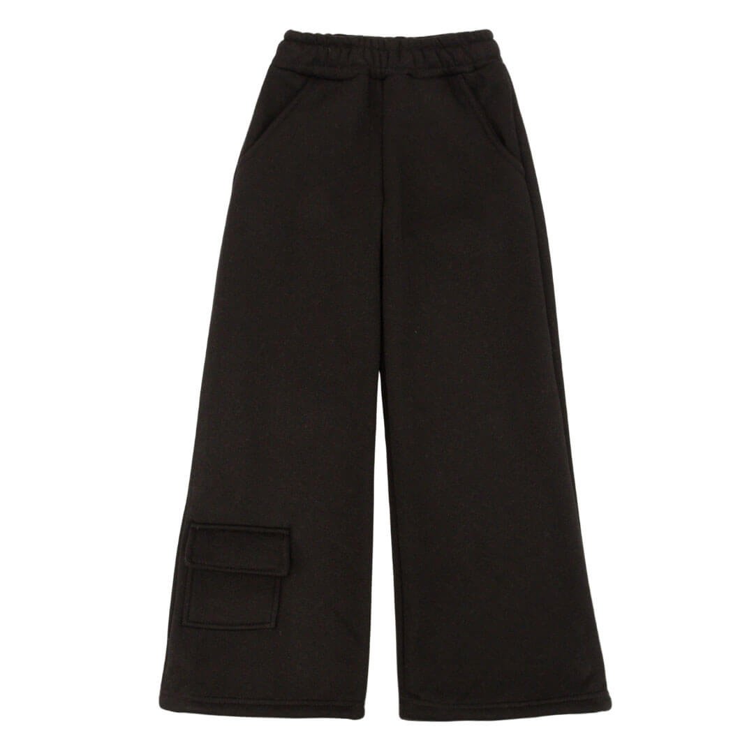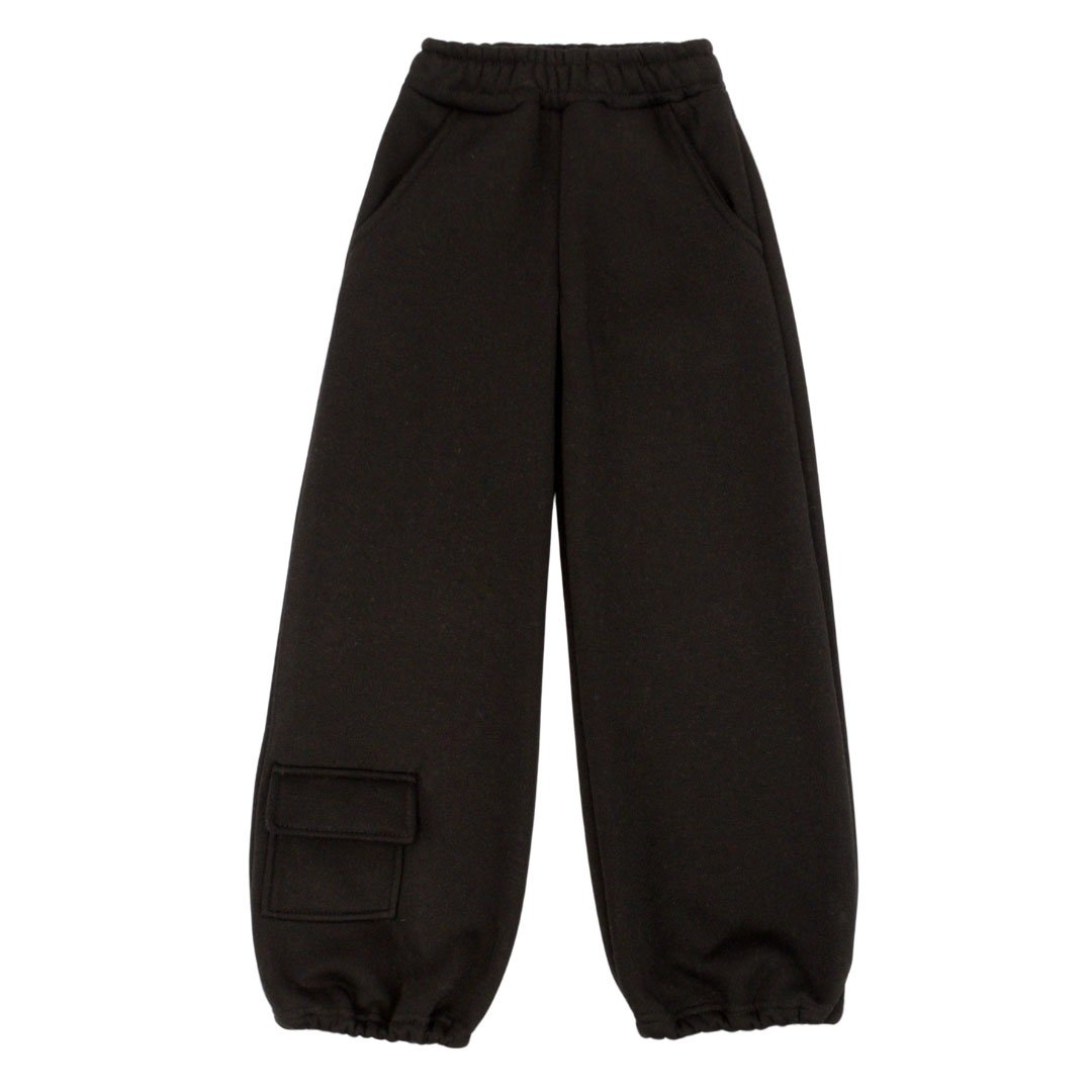 Дана модель дитячих штанів створена для активних дітей, які цінують комфорт і зручність в будь-якій ситуації. Штани виконані з щільної тринитки з начосом чорного кольору - матеріал надійно зберігає тепло і прекрасно підходить для холодного сезону. Крій штанів прямий, але внизу передбачена прихована резинка, завдяки якій можна легко змінити посадку: залишити низ вільним або злегка затягнути, перетворивши штани в стильні джогери. Таке рішення робить модель універсальною і зручною для різних типів взуття і погодних умов. З боків розташовані зручні кишені.