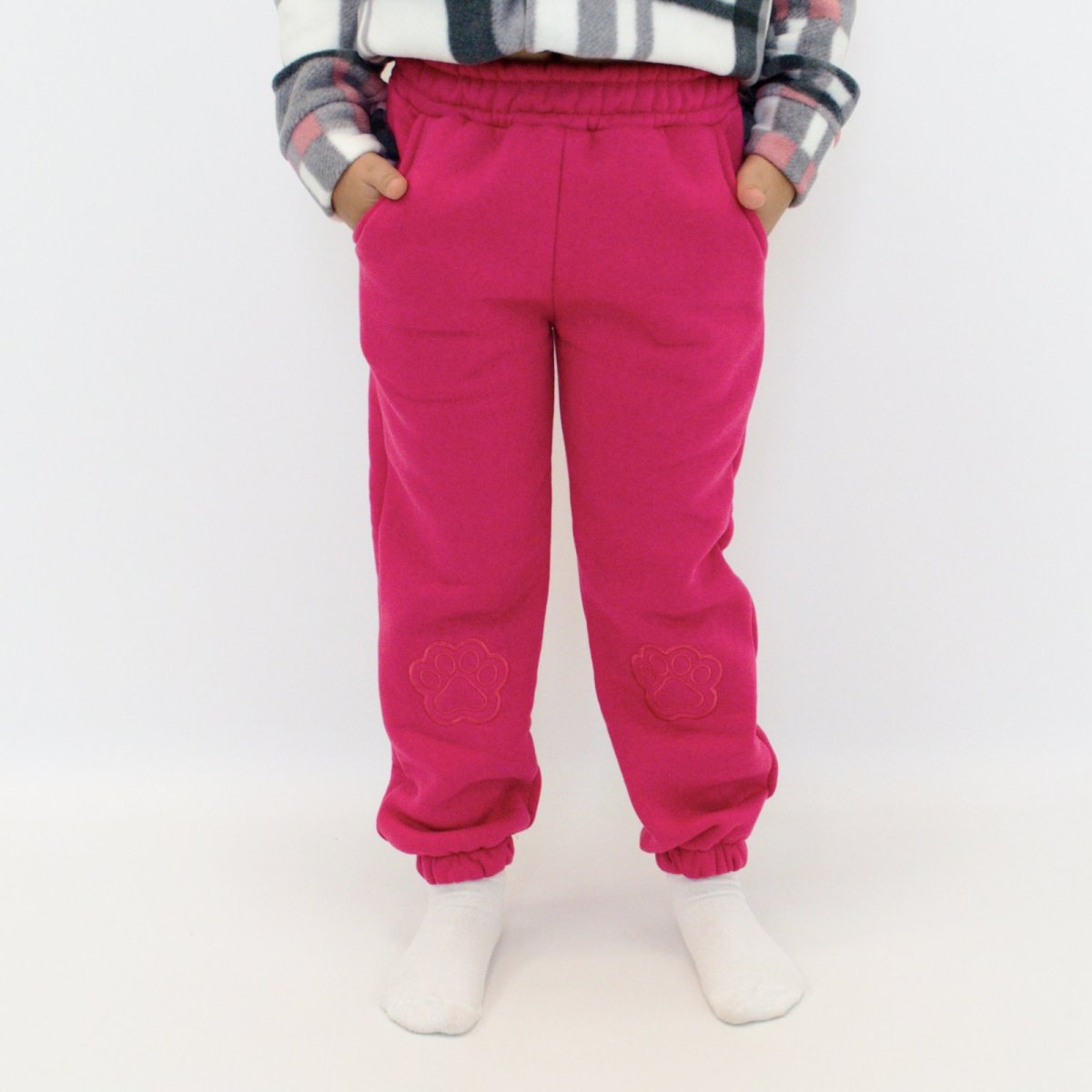 Дитячі штани виконані з якісного полотна трьохнитка малинового кольору, яке поєднує м'якість і щільність, забезпечуючи комфорт і довговічність. Модель представлена в однотонному виконанні, але цікавим акцентом служить об'ємний малюнок на колінах - він додає оригінальності та подобається дітям. Вільний крій не обмежує рухи, а еластичний пояс з гумкою забезпечує зручну посадку, дозволяючи штанам триматися комфортно протягом усього дня. Вбудовані кишені роблять модель більш практичною. Манжети по низу брюк фіксують штанину і допомагають утримувати тепло.