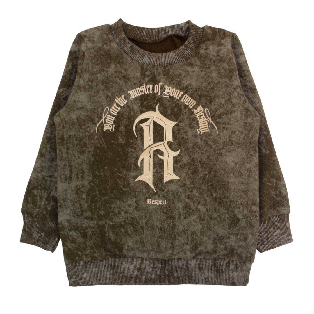 Представлена модель дитячого джемпера виконана з полотна двонитка шоколадного кольору з написом Respect. Матеріал приємний до тіла, добре тримає форму і підходить для активного повсякденного носіння. По всій поверхні тканини розташований стильний принт, який гармонійно доповнює фарбування спереду. Вільний крій забезпечує комфортну посадку та не обмежує рухи дитини під час ігор, прогулянок або занять. Манжети по низу виробу і на рукавах акуратно фіксують виріб. Матеріал стійкий до зносу, не скочується і залишається приємним на дотик. Джемпер представлений в декількох кольорах, що дозволяє легко підібрати варіант під будь-який гардероб.