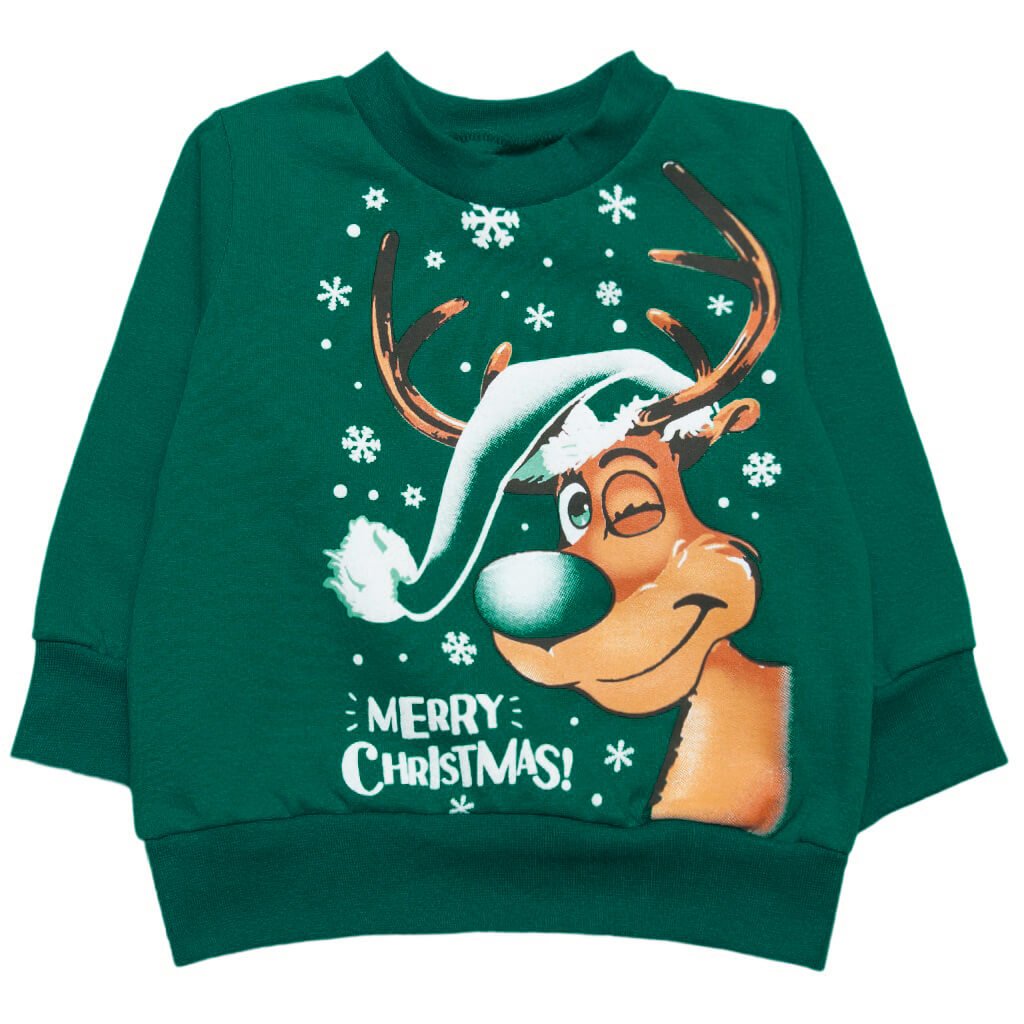 Джемпер дитячий зеленого кольору з малюнком новорічного оленя прекрасно підійде для холодної пори року. Джемпер пошитий з утепленого полотна - начіс, яке на 100% складається з бавовни. Виріб представлено в різних кольорах з яскравим малюнком посередині. Рукава з манжетами, а горловина і низ оброблені стрейчем з тканини, що добре тягнеться. В такому джемпері Вашому моднику буде комфортно і тепло. До такої кофтини підійдуть майже будь-які джинси або штанці, які Ви також можете придбати у нас. Замовте дитячий джемпер просто зараз, адже кількість дуже обмежена!