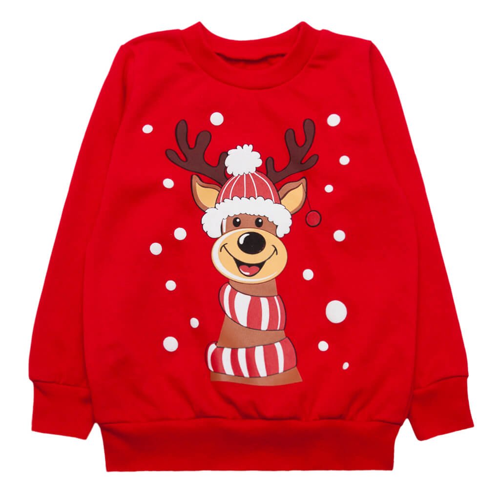 Джемпер дитячий червоного кольору з малюнком новорічного оленя, прекрасно підійде для холодної пори року. Джемпер пошитий з утепленого полотна - начіс, яке на 100% складається з бавовни. Виріб представлено в різних кольорах з яскравим малюнком посередині. Рукава з манжетами, а горловина і низ оброблені стрейчем з тканини, що добре тягнеться. В такому джемпері Вашому моднику буде комфортно і тепло. До такої кофтини підійдуть майже будь-які джинси або штанці, які Ви також можете придбати у нас. Замовте дитячий джемпер просто зараз, адже кількість дуже обмежена!