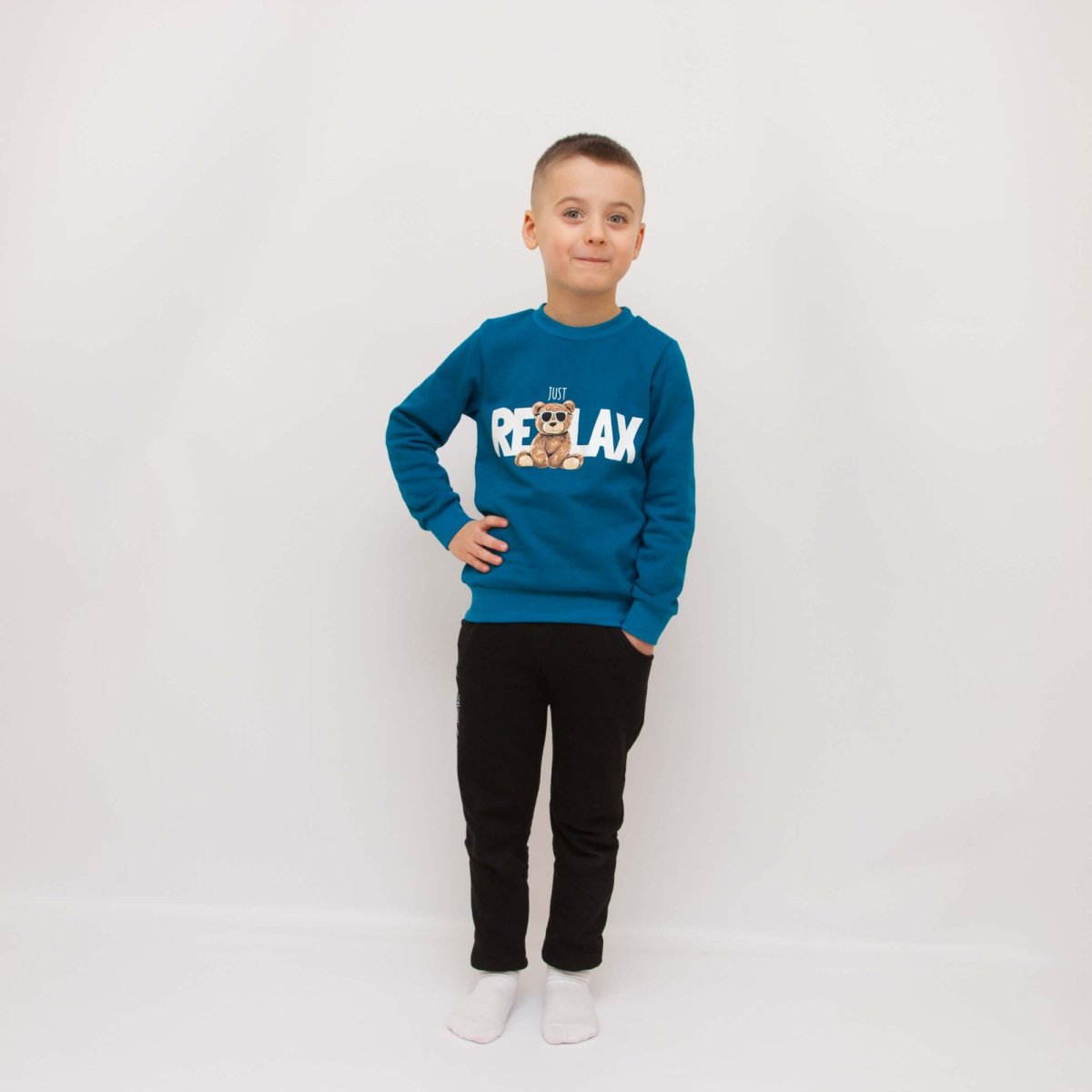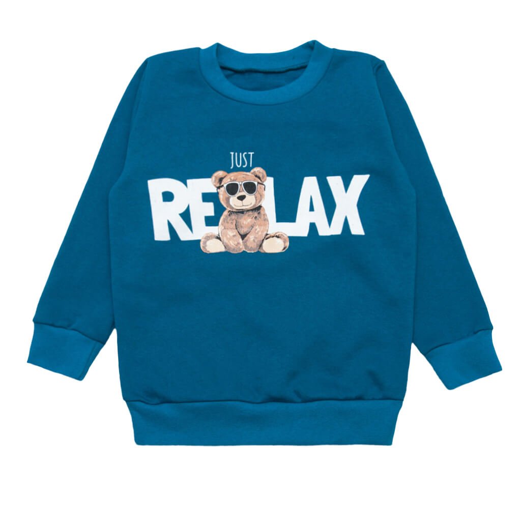 Джемпер дитячий темно-бірюзового кольору із написом RELAX, прекрасно підійде для холодної пори року. Джемпер пошитий з утепленого полотна - начіс, яке на 100% складається з бавовни. Виріб представлено в різних кольорах з яскравим малюнком посередині. Рукава з манжетами, а горловина і низ оброблені стрейчем з тканини, що добре тягнеться. В такому джемпері Вашому моднику буде комфортно і тепло. До такої кофтини підійдуть майже будь-які джинси або штанці, які Ви також можете придбати у нас. Замовте дитячий джемпер просто зараз, адже кількість дуже обмежена!