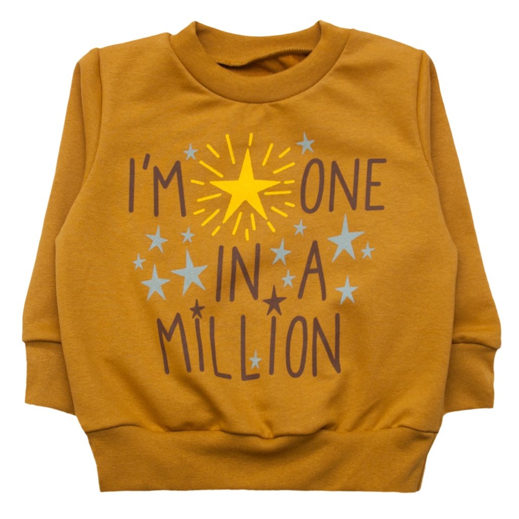 У кожного хлопчиська повинні бути сучасні і якісні речі. У нашому інтернет-магазині тільки кращі новинки. Джемпер для справжніх модників виготовлений з високоякісної двухніткі. Такий матеріал підійде для весни та осені - тобто для демісезонного періоду. Доповнює джемпер яскраве фарбування спереду "Я один на мільйон". Також є манжети на руках, горловині та по низу. Представлений джемпер в гірчичному кольорі точно не залишить байдужим Вас і Вашого маленького модника. «Арлекін» з турботою ставиться до всіх своїх клієнтів! Вдалих покупок.