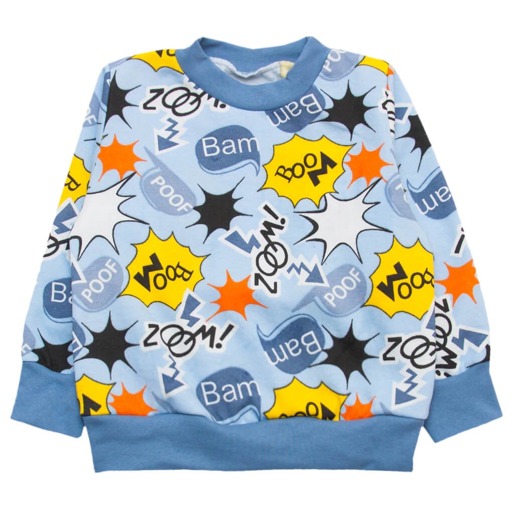 Джемпери - дуже практичний і універсальний одяг в гардеробі кожної людини. Найчастіше хлопчакам подобаються яскраві та барвисті кофтинки з різними малюнками. У нашому інтернет-магазині ТМ Арлекин неймовірно великий та різноманітний вибір дитячих джемперів. Представлена модель блакитного світшота пошита з якісного начісного полотна. Матеріал гіпоалергенний і натуральний, тому повністю безпечний для ніжної та чутливої дитячої шкіри. По всьому полотну присутні зображення з написом "Бум" тощо. Усі краї оброблені манжетами приємного блакитного кольору.