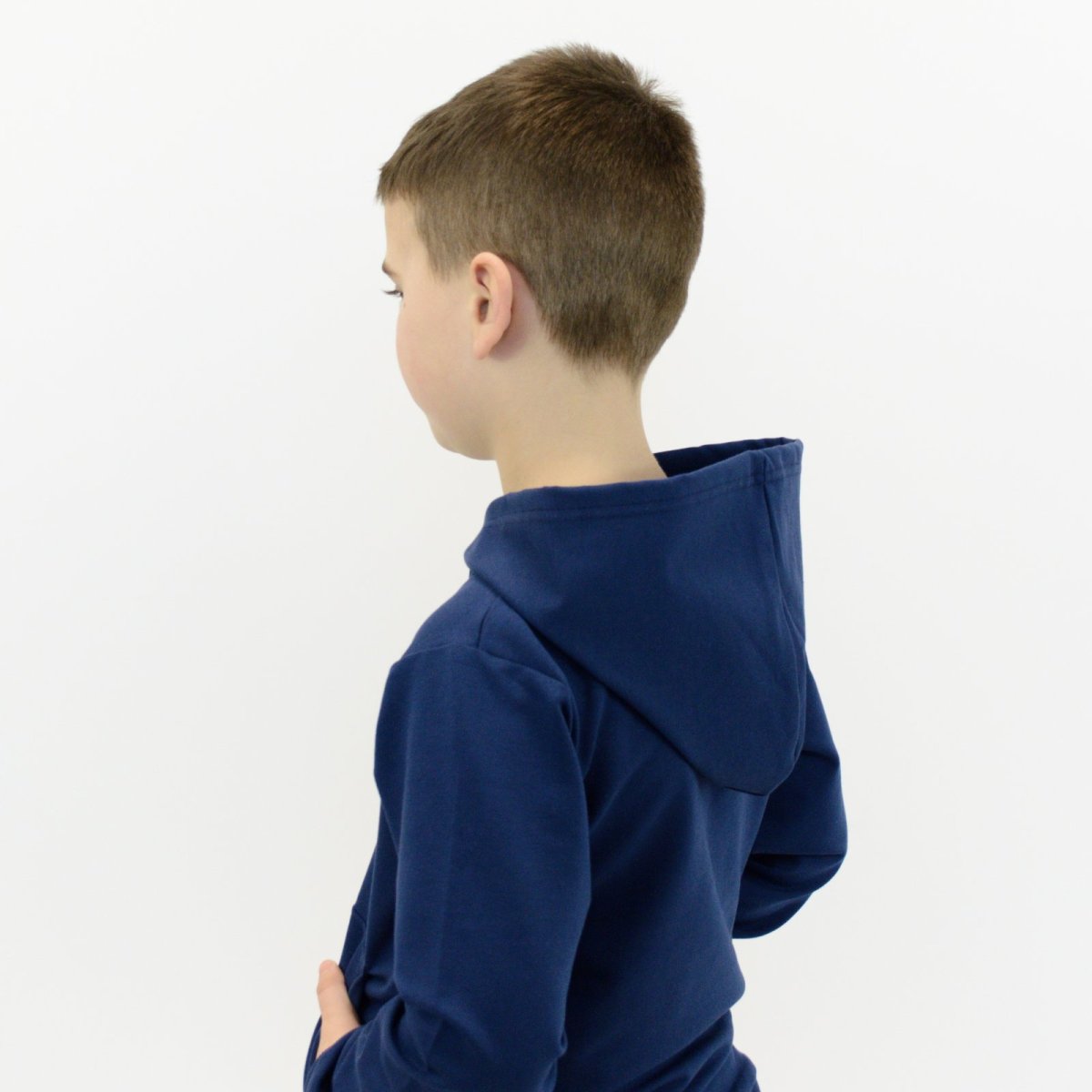 Дитяче худі кольору індиго з полотна двонитка - це ідеальний вибір на прохолодний сезон, коли хочеться, щоб дитині було тепло та комфортно. Двонитка - це матеріал, який вирізняється своєю щільністю і зносостійкістю, водночас залишається м'яким і приємним на дотик. Зручний капюшон захищає голову дитини від вітру. Завдяки вільному крою, виріб не сковує рухів, даючи змогу малюкові активно грати та займатися улюбленими справами, чи то ігри на вулиці, чи то заняття спортом. Також худі доповнено еластичними манжетами по краях і місткою кишенею на передній стороні.