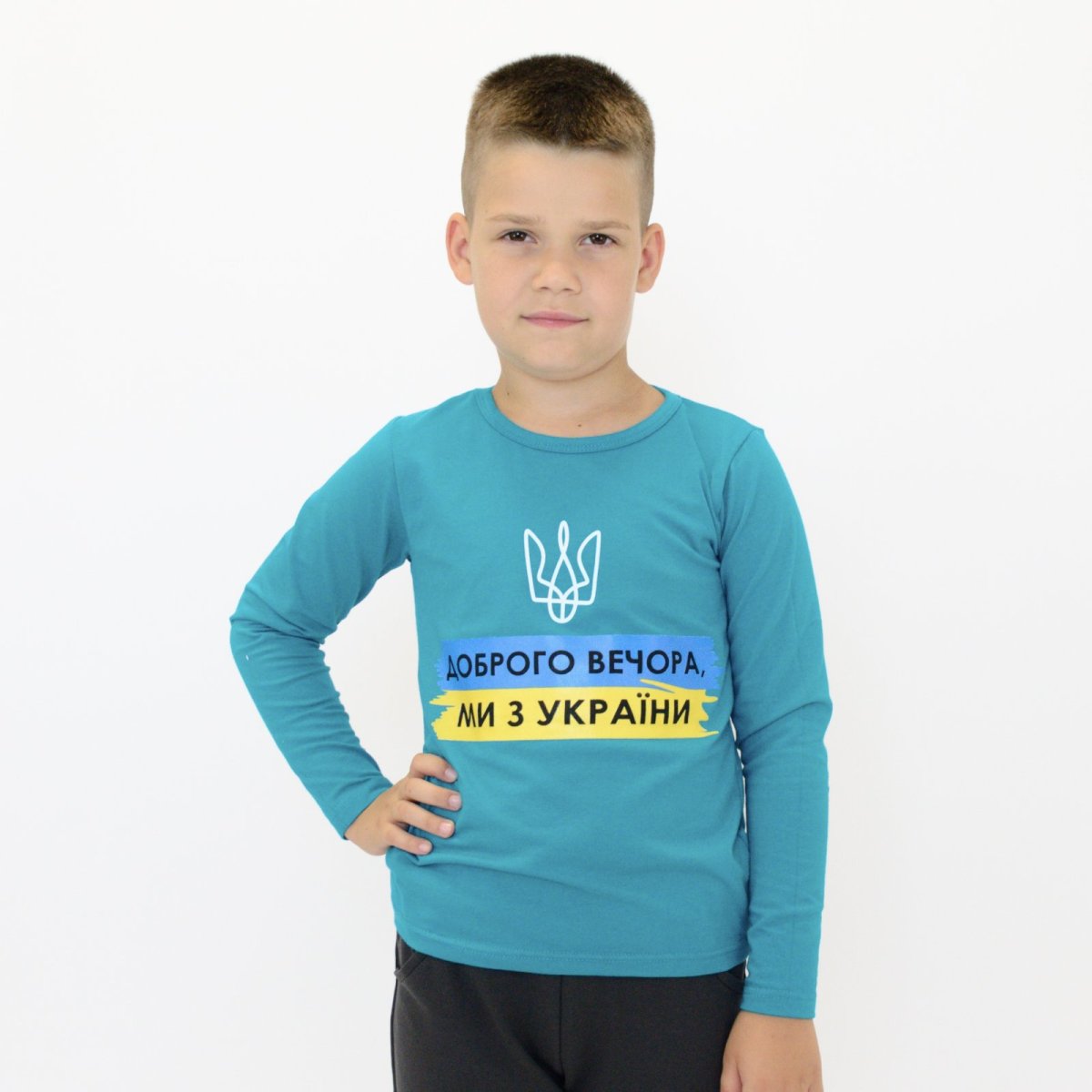 Реглан необхідна річ у гардеробі кожного малюка. Ця модель пошита з якісного, м'якого полотна стрейч-кулір темно-бірюзового кольору. Полотно складається з бавовни з додаванням лайкри, за рахунок цього добре тягнеться і моделька добре сідає по фігурі. Полотно приємне до тіла і не береться катишками. Горловина оброблена бейкою з основного полотна, рукава і низ реглана оброблені розпошивом. Красиві, соковиті кольори доповнює стильний напис "Доброго вечора, ми з України" по переду виробу. Вибирайте потрібний розмір і колір, що сподобався, і швидше оформляйте замовлення.