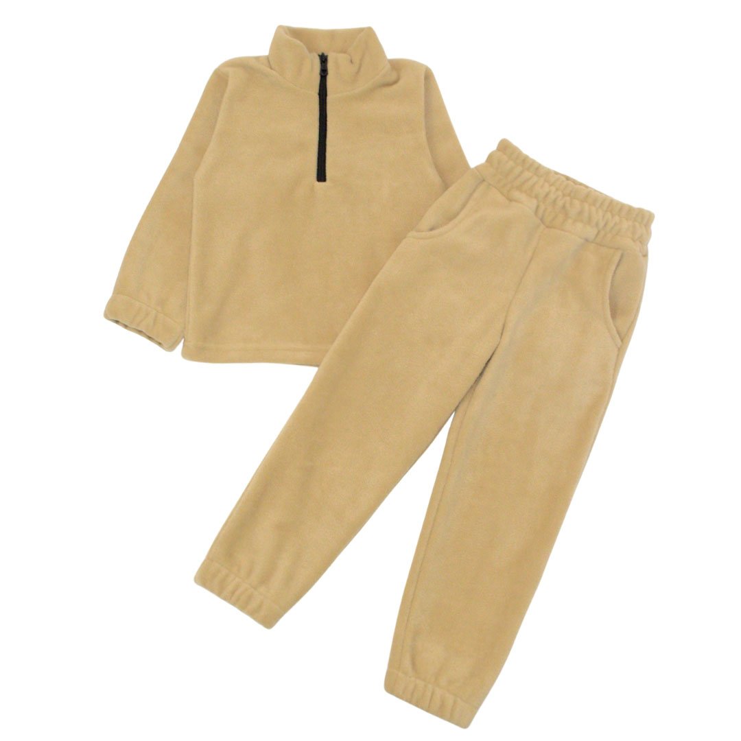 Новий дитячий костюм бежевого кольору складається з теплого світшота і зручних штанів, які забезпечать дитині максимальний комфорт і захист від холоду. вироби виконані з високоякісного флісового полотна. Світшот має високий комір із блискавкою, яка розстібається до грудей. Манжети на рукавах доповнені м'якими резинками, що запобігають потраплянню холодного повітря всередину. Штани виконані з еластичним поясом і манжетами на штанинах, що забезпечує ідеальну посадку. Флісове полотно приємне на дотик і м'яко прилягає до тіла, не викликаючи подразнень і дискомфорту. Універсальний дизайн дає змогу легко комбінувати його з іншим одягом, створюючи стильні та практичні образи.