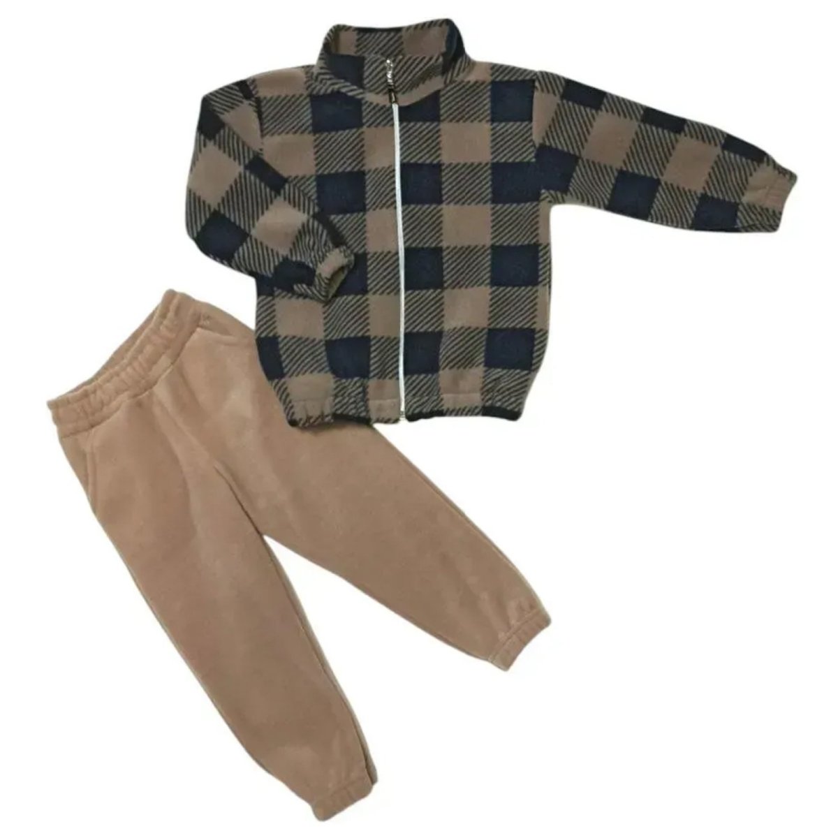 Іноді прості речі дивують найбільше - саме так можна описати цей чарівний дитячий костюм коричневого кольору, що поєднує в собі тепло, комфорт і стиль. З першого погляду привертає увагу кофта на блискавці, виконана в класичну велику клітинку. Полотно з м'якого флісу дарує приємні відчуття при носінні і надійно захищає від прохолоди. Прямий крій не сковує рухи, дозволяючи дитині відчувати себе вільно в будь-якій ситуації. Штани однотонні, в тон основного кольору сорочки, зі зручною резинкою на поясі і манжетах. Практичні бічні кишені додають функціональності. Цей комплект ідеально підійде для осінніх прогулянок і походів в садок.