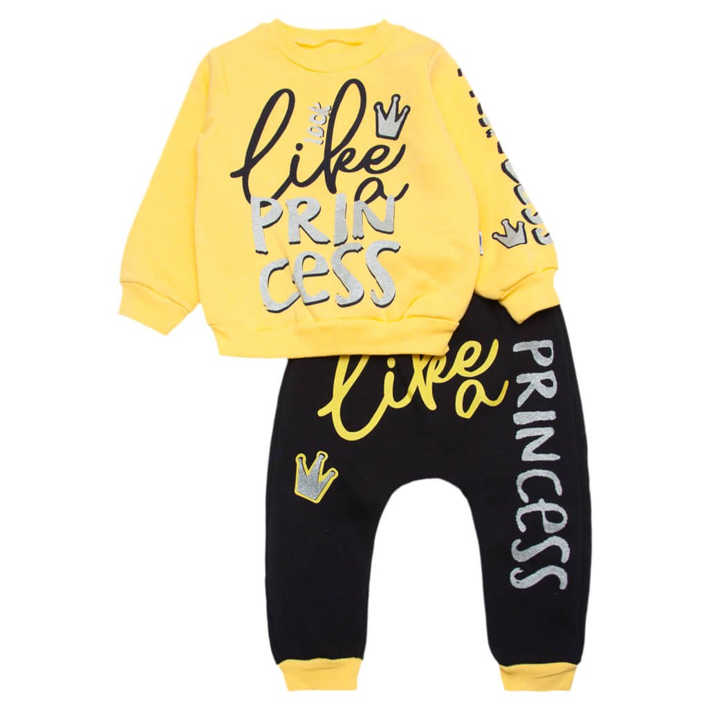 Теплий костюм для дівчинки супер новинка нашого інтернет-магазину. Костюм виконаний з якісного полотна трехнитка начіс. Це полотно користується популярністю за рахунок своїх якостей. Носиться добре, не кошлатиться, не втрачає форму і колір. З такого полотна шиються теплі костюми як для діток, так і дорослих. Дана модель костюма виготовлена в дух кольорах, верх жовтий, низ темний. На джемпері є манжети з стрейча, як і на штанцях, по низу джемпера також стрейч. Родзинкою цього комплекту є поєднання кольорів, а також красиві і стильні фарбування на штанцях і кофтині.