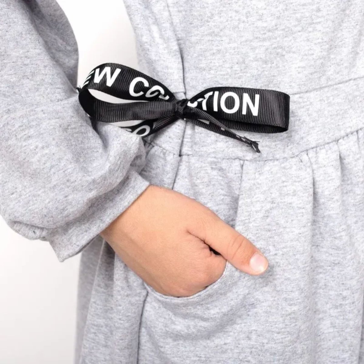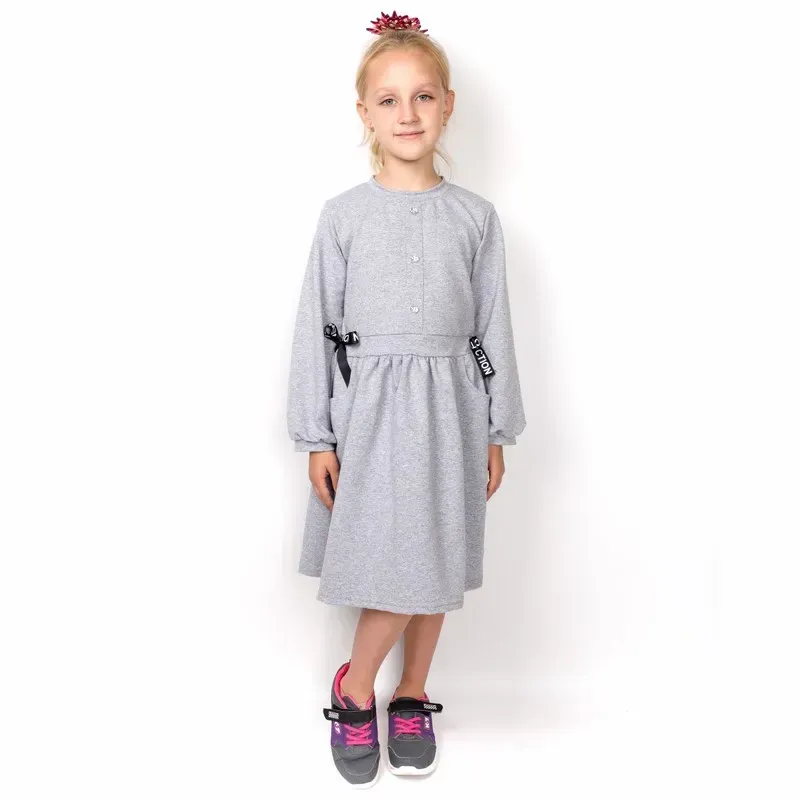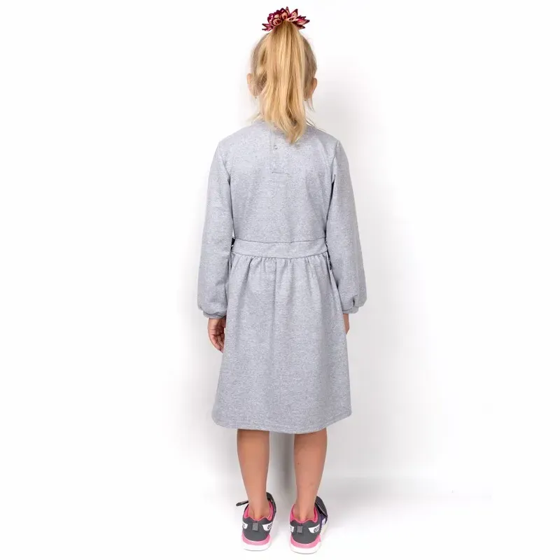 Представлена модель дитячої сукні виконана з м'якого полотна двонитка сірого кольору: щільний, але дихаючий матеріал з легкою текстурою подарує комфорт в демісезонний період, зберігши тепло і свободу рухів дитини. Елегантна горловина і рукави-ліхтарики додають витончений силует, а застібки-кнопки на спинці полегшують процес переодягання. Також на виробі присутні зручні бічні кишені - як функціональний елемент, так і декоративний акцент. Пояс акуратно підкреслює лінію, створюючи легкий об'єм спідниці, який піднімає настрій і робить образ по-дитячому повітряним.