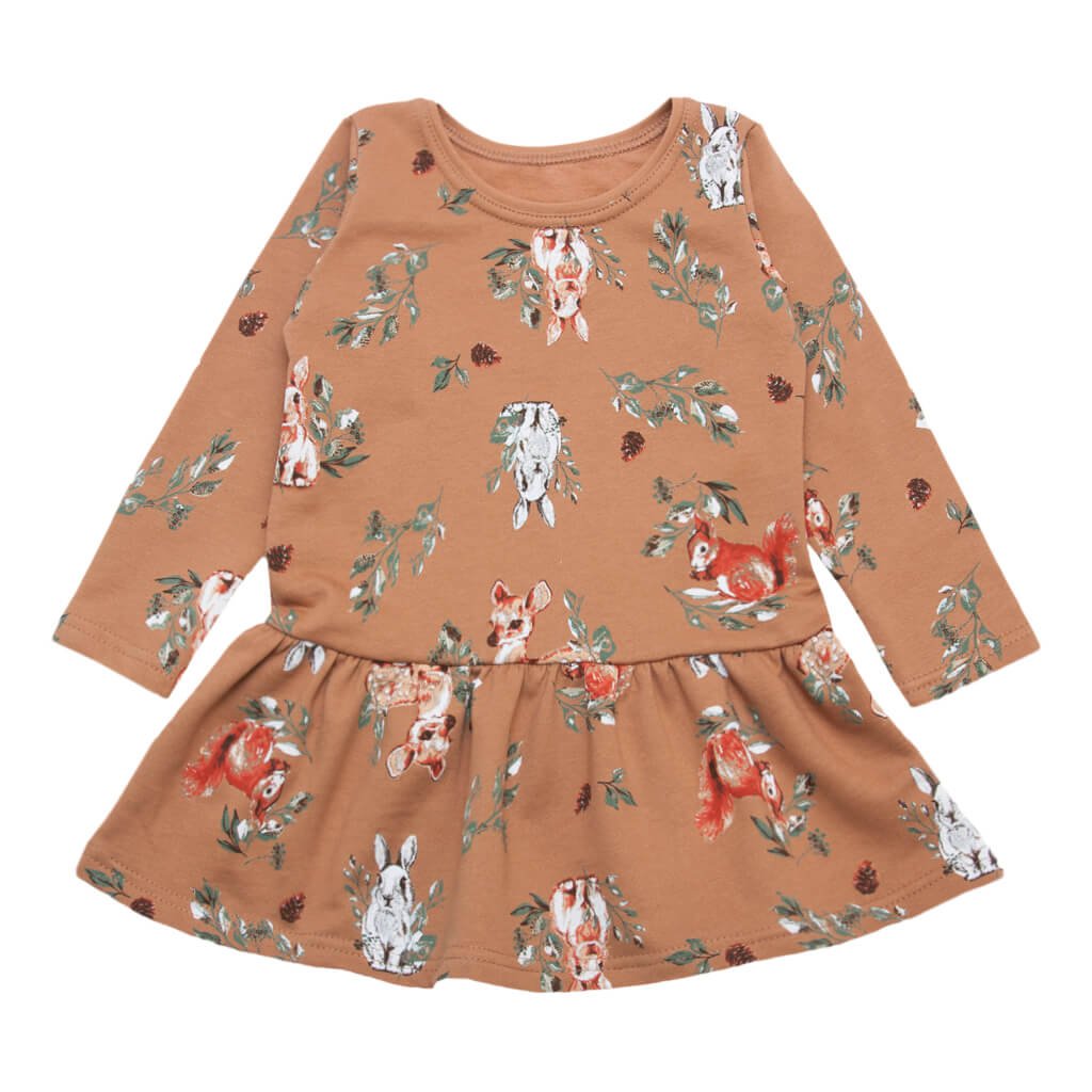 Дитяча сукня з начісом для дівчинки - ідеальний варіант для холодної пори року. Завдяки м'якому та щільному матеріалу вона прекрасно зберігає тепло, забезпечуючи комфорт навіть у найпрохолодніші дні. По всій тканині присутні красиві малюнки та візерунки, які точно сподобаються маленькій модниці. Така бежева сукня з малюнками оленятка та зайчика стане відмінним вибором як для повсякденного носіння, так і для особливих моментів. Вільний крій виробу дозволяє дитині вільно рухатися, що особливо важливо для активних дівчаток. Міцна якість матеріалу гарантує довговічність, а яскраві принти не вицвітають з часом.