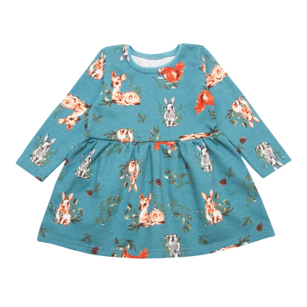 Складно уявити сучасну дівчинку без красивої сукні, яка ідеально підходить для холодної пори року. Ця сукня з начісом стане справжнім порятунком у прохолодні дні. Вона виконана з якісного і щільного матеріалу, який забезпечить надійний захист від холоду, зберігаючи тепло і затишок протягом усього дня. Сукня бірюзового кольору з малюнками звіряток Бембі з довгими рукавами, що робить її ідеальною для осінньо-зимового періоду. Модель відрізняється вільним кроєм, який не сковує рухів. Ця сукня підійде для будь-якого приводу: від повсякденного носіння до святкових заходів, де малятко матиме стильний і привабливий вигляд.