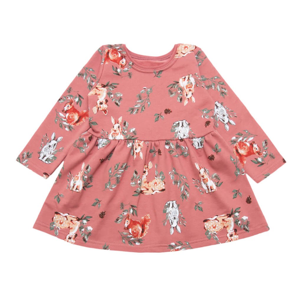 Складно уявити сучасну дівчинку без красивої сукні, яка ідеально підходить для холодної пори року. Ця сукня з начісом стане справжнім порятунком у прохолодні дні. Вона виконана з якісного і щільного матеріалу, який забезпечить надійний захист від холоду, зберігаючи тепло і затишок протягом усього дня. Сукня теракотового кольору з малюнками звіряток Бембі з довгими рукавами, що робить її ідеальною для осінньо-зимового періоду. Модель відрізняється вільним кроєм, який не сковує рухів. Ця сукня підійде для будь-якого приводу: від повсякденного носіння до святкових заходів, де малятко матиме стильний і привабливий вигляд.