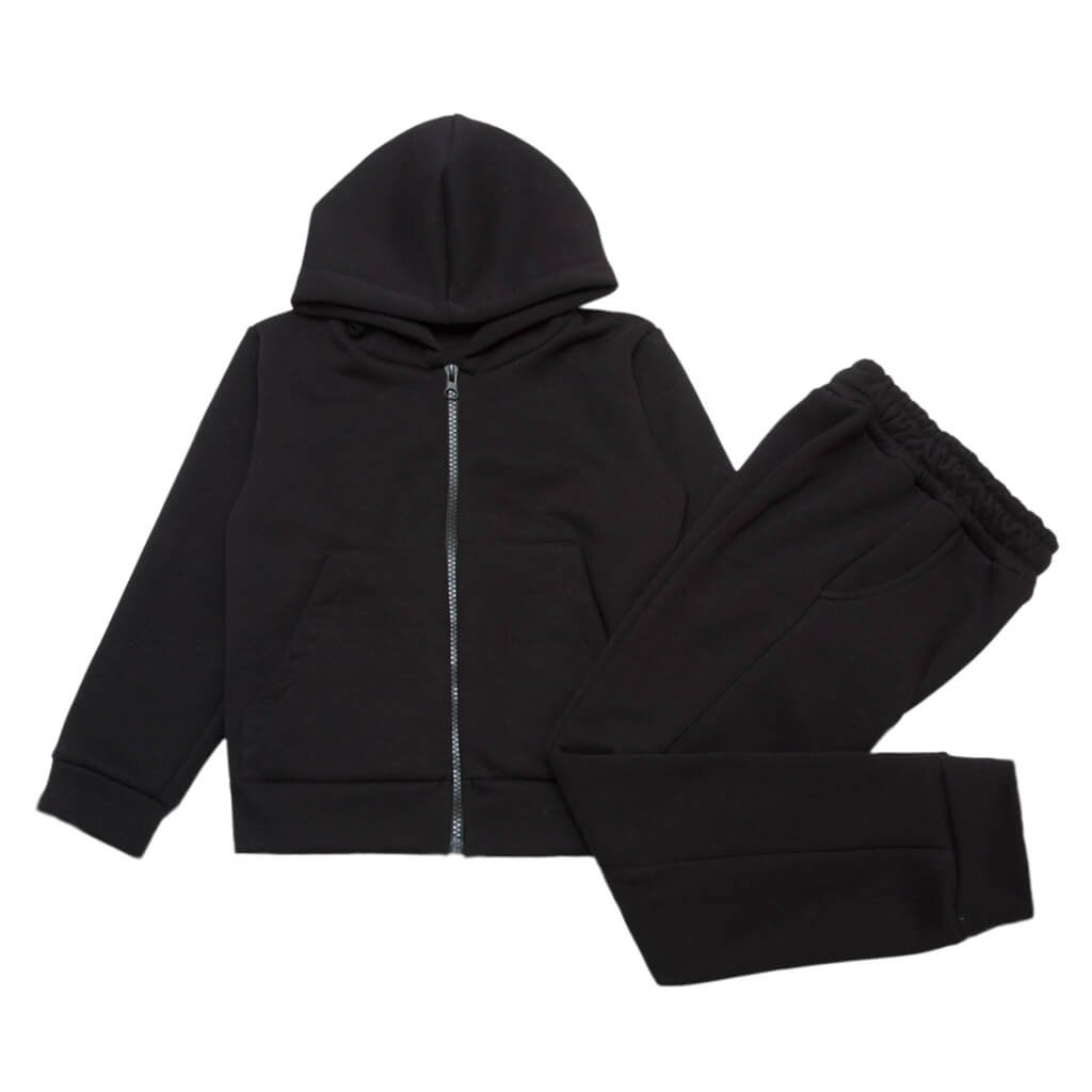 Дитячий спортивний костюм виготовлений з високоякісного трикотажного полотна - трьохнитки з начосом чорного кольору. Це м'який та теплий матеріал, який подарує Вашій дитині максимальне відчуття комфорту і тепла. Костюм складається з кофтинки на блискавці і штанців. Також кофта має капюшон і невеликі кишеньки. Штанці виконані на м'якій гумці. Спортивний костюм з начісної трьохнитки легко переться і довгий час зберігає свій первісний вигляд та якість. Представлена модель дитячого костюма відмінно підійде як для занять спортом, так і для повсякденного носіння.