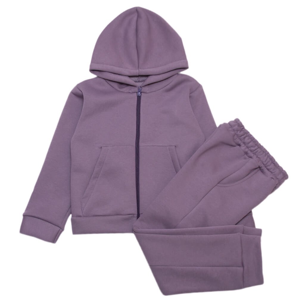 Дитячий спортивний костюм виготовлений з високоякісного трикотажного полотна - трьохнитки з начосом лілового кольору. Це м'який та теплий матеріал, який подарує Вашій дитині максимальне відчуття комфорту і тепла. Костюм складається з кофтинки на блискавці і штанців. Також кофта має капюшон і невеликі кишеньки. Штанці виконані на м'якій гумці. Спортивний костюм з начісної трьохнитки легко переться і довгий час зберігає свій первісний вигляд та якість. Представлена модель дитячого костюма відмінно підійде як для занять спортом, так і для повсякденного носіння.