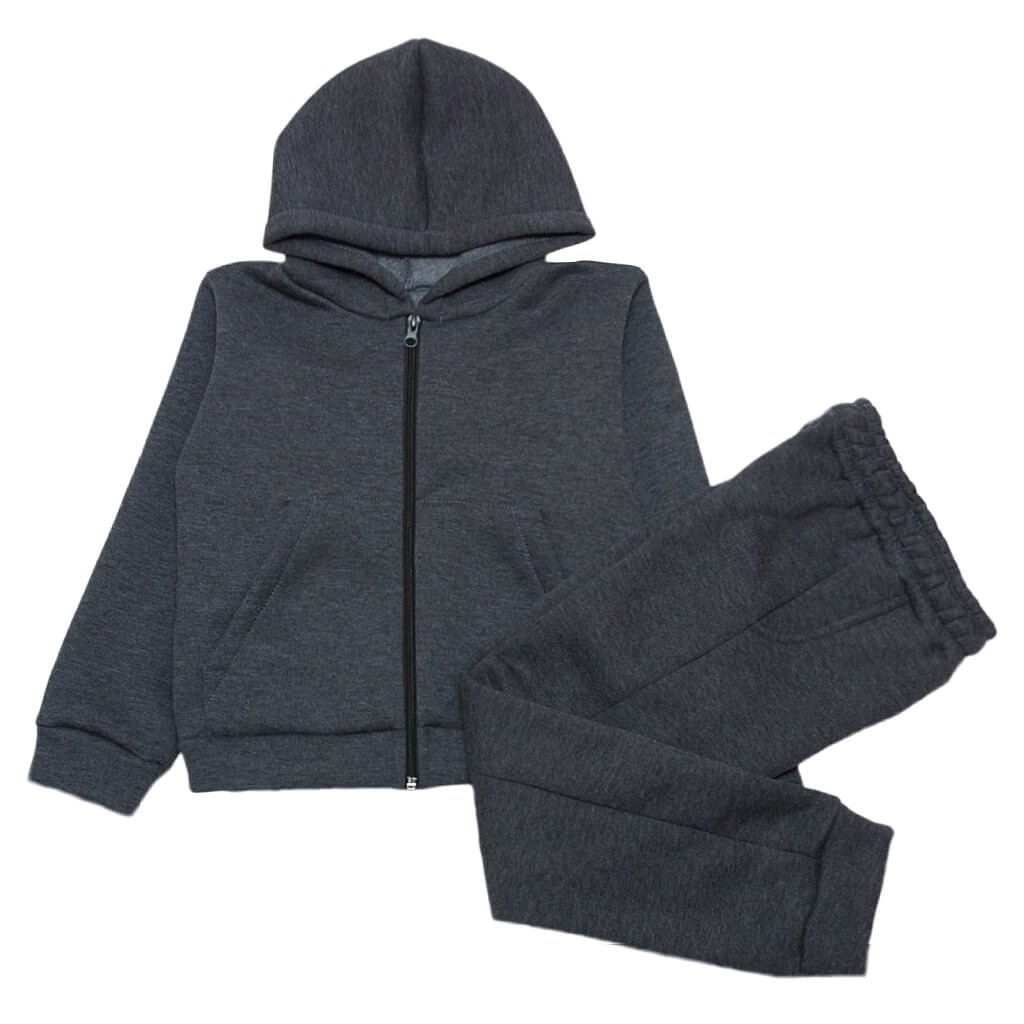 Дитячий спортивний костюм виготовлений з високоякісного трикотажного полотна - трьохнитки з начосом темно-сірого кольору. Це м'який та теплий матеріал, який подарує Вашій дитині максимальне відчуття комфорту і тепла. Костюм складається з кофтинки на блискавці і штанців. Також кофта має капюшон і невеликі кишеньки. Штанці виконані на м'якій гумці. Спортивний костюм з начісної трьохнитки легко переться і довгий час зберігає свій первісний вигляд та якість. Представлена модель дитячого костюма відмінно підійде як для занять спортом, так і для повсякденного носіння.