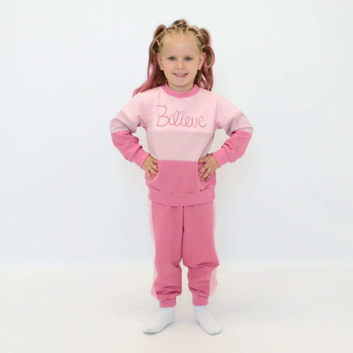 Спортивний костюм для юної модниці пошитий з щільного якісного полотна - двунитка кольру пильної троянди, яке складається на 94% з бавовни і на 6% з лайкри. Модель цього костюма проста, але в той же час стильна. Дану модель можна використовувати як для вечірніх прогулянок, так і для занять спортом. Комплект комбінований трьома кольорами, які гармонійно поєднуються між собою. Горловина і низ, а також на рукавах стрейч. На штанцях по низу також стрейч, в поясі м'яка еластична резиночка, котра не стискає тіло. З боків штанців вставки білого кольору, що виглядає дуже стильно. На кофтині спереду вставки з декількох кольорів. А прикрашає цей костюм високоякісне фарбування Believe спереду кофти, який обов'язково сподобається Вашій дівчинці.