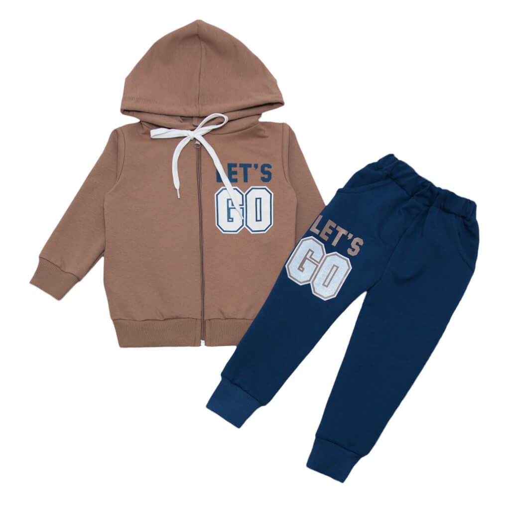 Інтернет-магазин "Арлекин" хоче порадувати Вас своєю неймовірно стильною новинкою. Спортивний костюм дитячий складається з кофти бежевого кольору та штанців кольору індиго. Представлені вироби виготовлено з високоякісного трикотажного полотна - двонитки. Ця тканина повністю складається з натуральної бавовни, тому полотно абсолютно безпечне для шкіри дитини. У такому спортивному костюмі вашій дитині буде максимально комфортно. Кофта доповнена затишним капюшоном. На штанах присутні кишеньки. Також представлений костюм доповнений стильним написом LET'S GO, який точно сподобається Вашій дитинці.