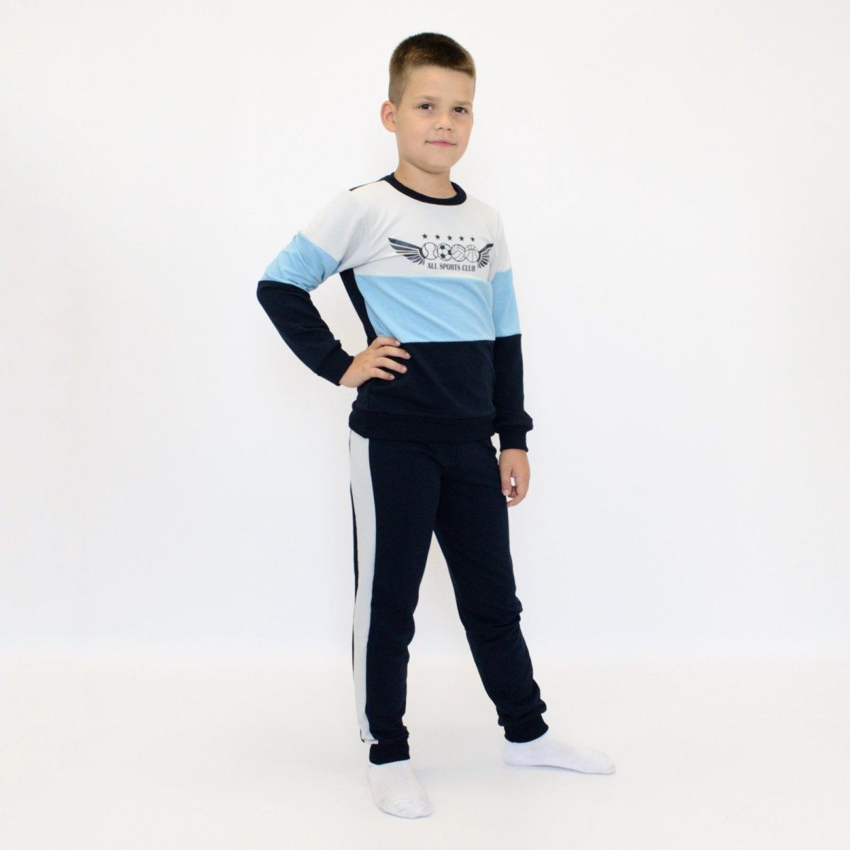 Пропонуємо Вашій увазі неймовірну новинку нашого інтернет-магазину - спортивний костюм для хлопчика. Модний комплект виготовлений з якісного полотна двунитка і комбінований трьома кольорами, а саме (сірий, темно-синій, блакитний), який дуже сподобається вашому захиснику. Полотно досить щільне, для спортивних костюмів підходить ідеально, в носінні не витягуються і не затираються коліна і ліктики. Дизайн костюма цікавий але в той же час досить простий. На рукавах, по низу кофти, і по низу штанців манжети із стрейчевого полотна. Кофта комбінована трьома кольорами,а в штанах сіра вставка, завдяки якій дуже гармонійно доповнюють один одного.