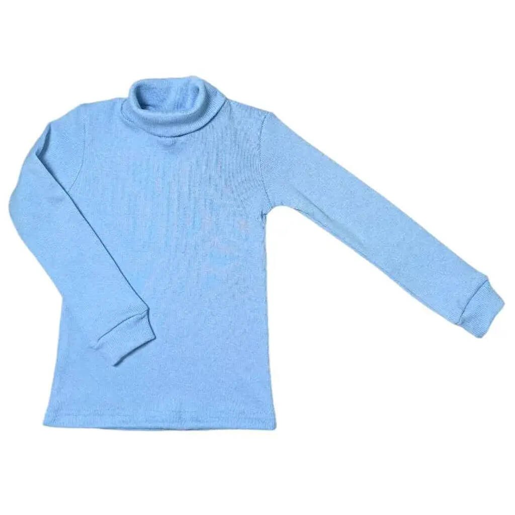 Дитячий гольф із горлом із утепленого рубчика блакитного кольору підійде на прохолодну пору року. Усередині дитяча водолазка для хлопчика та дівчинки утеплена невеликим начісом, а це означає, що навіть на зиму така водолазка з горлом буде ідеальним варіантом. Водолазка з рубчика дуже добре тягнеться і зберігає свою форму за рахунок високого рівня еластичності тканини. Це бавовняна тканина, відрізняється високою якістю та зносостійкістю. Гольф на осінь, весну та зиму є базовою річчю, його можна комбінувати з будь-якими штанами і навіть спідницею, а також надягати під низ кофти.