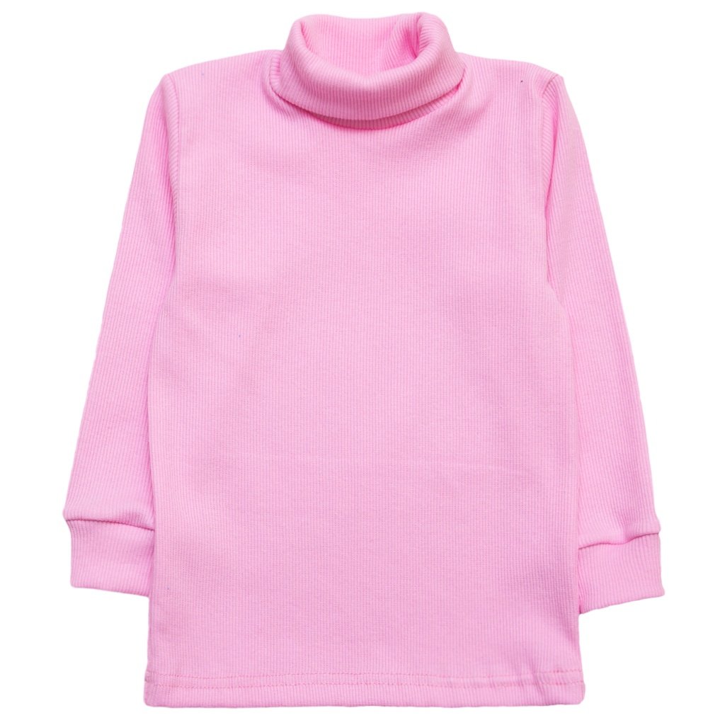 Однотонна водолазка для дівчинки світло-рожевого кольору з довгим рукавом пошита з еластичного полотна, лицьові і виворітні петлі якого чергуються. Полотно для водолазки добре тягнеться і приймає свій колишній вигляд, тому моделька відмінно сяде по фігурці вашої дитини. Така водолазка розрахована на дитячий вік від 1,5 року, до дев'яти років. Подвійний воріт-стійка з основного полотна добре закриває шию дитини, перешкоджаючи задування холодного вітру. Рукава на манжеті з рубчика, низ водолазки підшитий роспошивом.