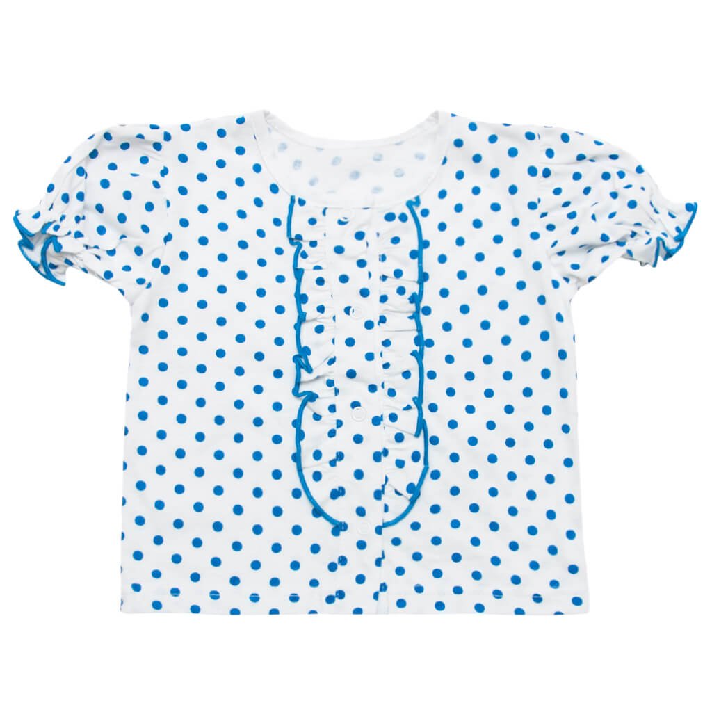 Модна кофтинка для ваших дівчаток, принт синій горох. Ця модель із серії «Літній верхній трикотаж». Модель цієї блузочки користується популярністю у матусь. Полотно, з якого виконано модель – «кулір». Кулір – це легкий та якісний матеріал, чудово підходить для легкого верхнього одягу. Блузочка має симпатичний зовнішній вигляд. Застібка-кнопка передбачена передньою планочкою, яка обрамлена рюшами з основного полотна. Рукав зроблено ліхтариком. Блузочка добре прилягає до тіла, тому дитині дуже зручно. Виглядає виріб дуже акуратно, в чому ви зможете переконатися, дивлячись на фото. ТМ Арлекін робить свою продукцію досконалою. Носіть із задоволенням.