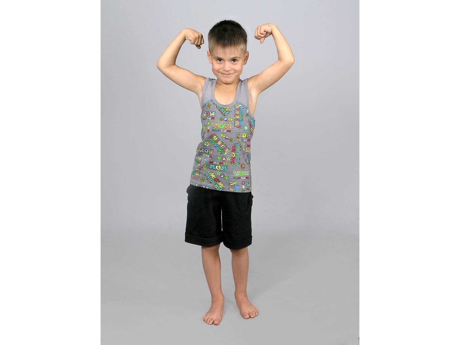 Літня футболка для хлопчиків. Зроблена із трикотажного полотна, який називається - «кулір». Кулір-це легке полотно, призначене для виробів літнього гардеробу. Розмірний ряд передбачає такі маєчки для хлопчаків від ясельного віку до школярів. Маєчка дуже приємного сірого кольору з яскравими написами. Пройми та горловина оброблені бейкою в тон. Така блакитна веселенька маєчка припаде до смаку вашому хлопчику. Дане забарвлення маєчки ви зможете поєднувати з жовтенькими, блакитними шортиками або бриджами, ваше чадо виглядатиме модно.